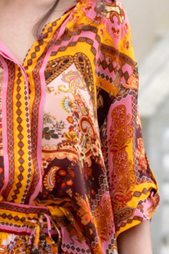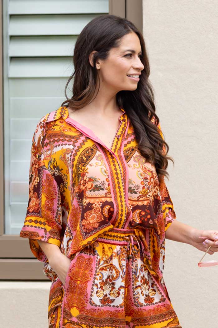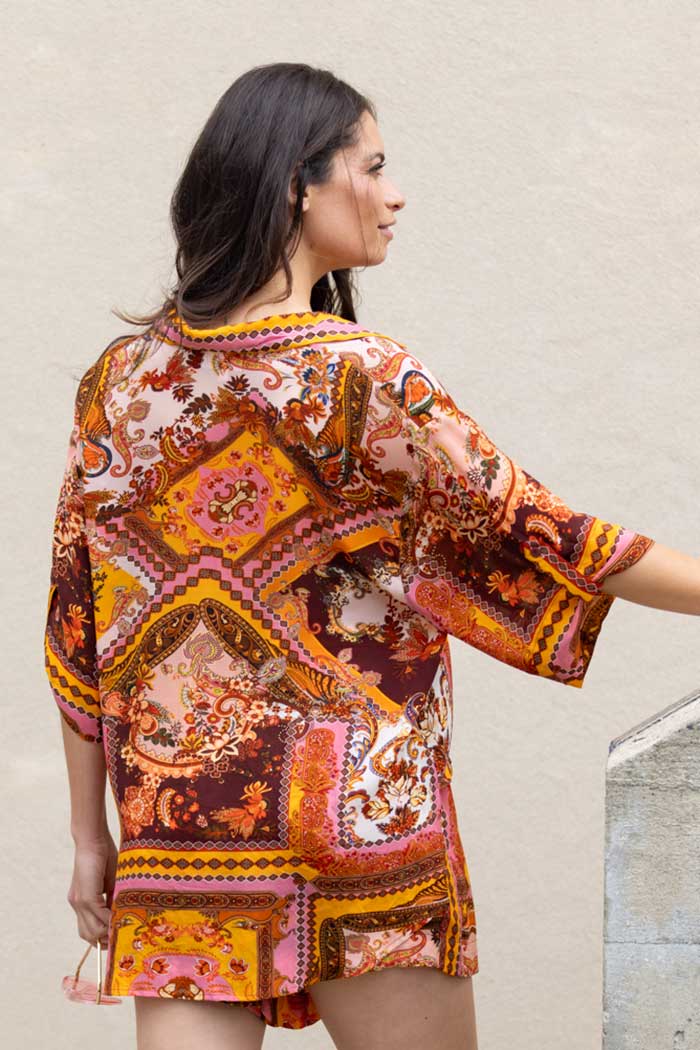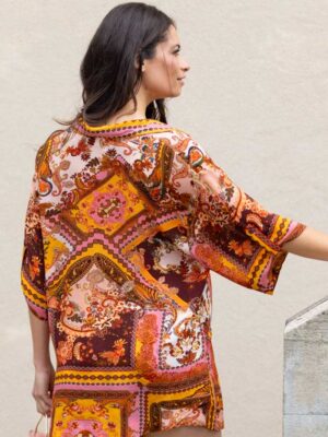 Add a touch of effortless style to your wardrobe with this lightweight rust-coloured shirt, crafted in a unique patchwork design. With its standard fit and soft, breathable fabric, it’s perfect for relaxed, everyday wear. The shirt features a flattering V-neck, short sleeves, a classic button-front, and a neat collar—effortless styling made easy. Unlined and versatile, it pairs beautifully with jeans, skirts, or tailored pants for an elevated yet comfortable look.