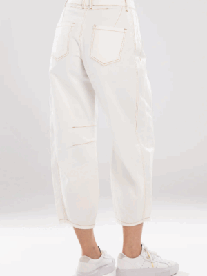 Elevate your spring and summer wardrobe with these Ivory Denim jeans. In a barrell leg style, beautifully flattering to most body shapes. Features tan stitch.