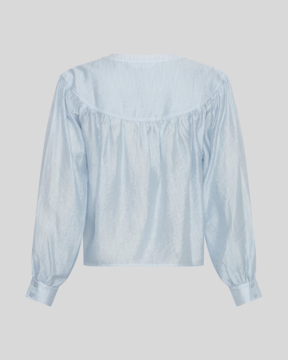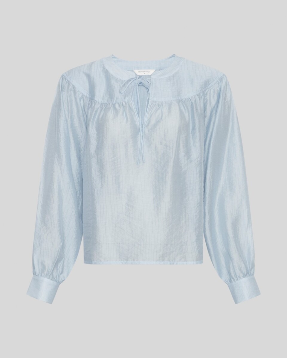 A feminine shirt, with a cutline around the chest and back. The cutline ends in a small tie detail on the front and has long raglan sleeves. The colour is a soft baby blue and the material is slightly see-through.