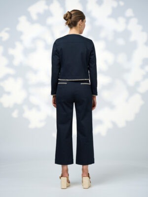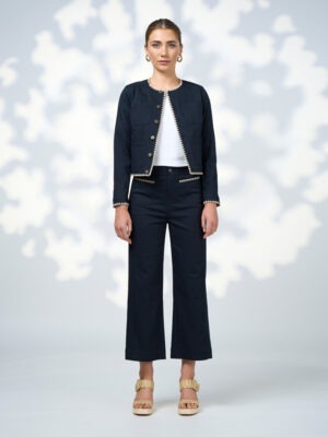 A stretch cotton twill fitted jacket with flattering princess seams and embroidery detailing on hems, neckline and placket edges. With front patch pockets.