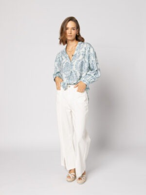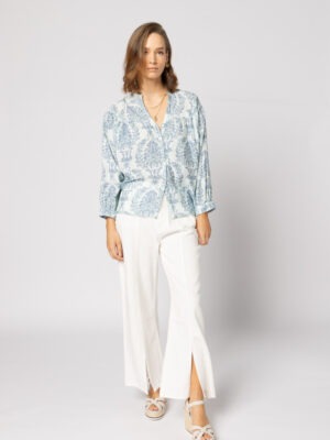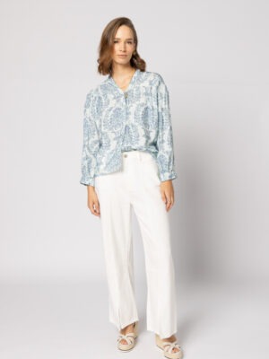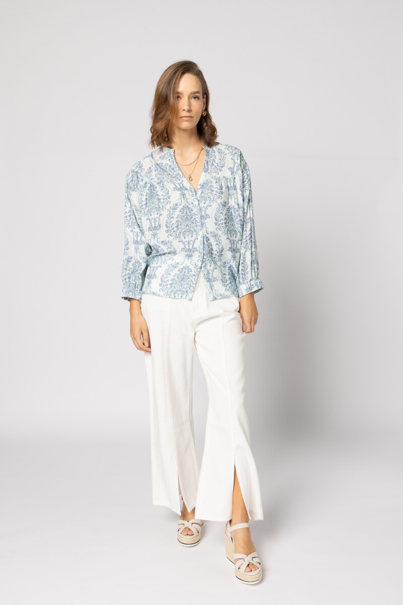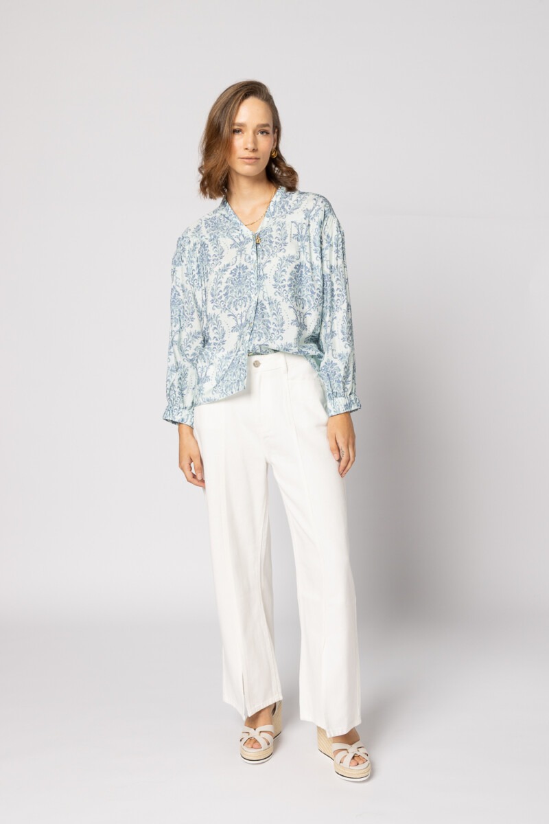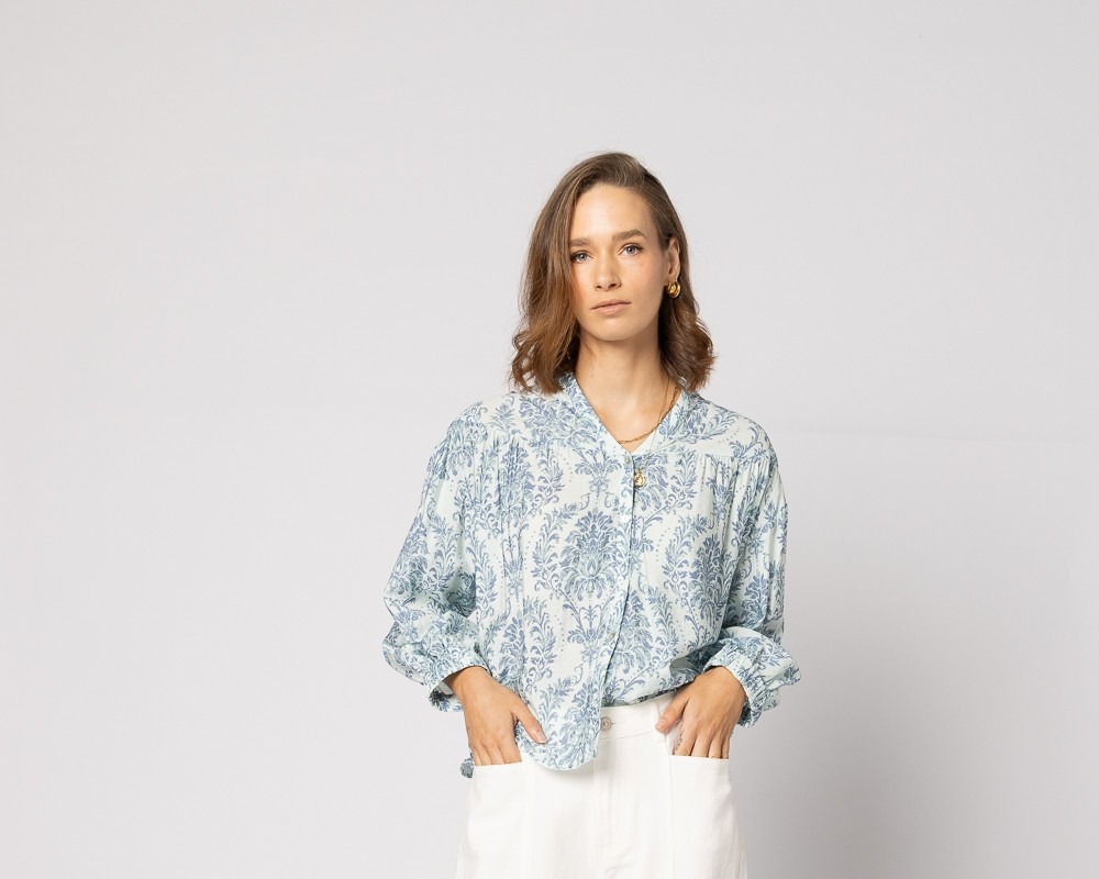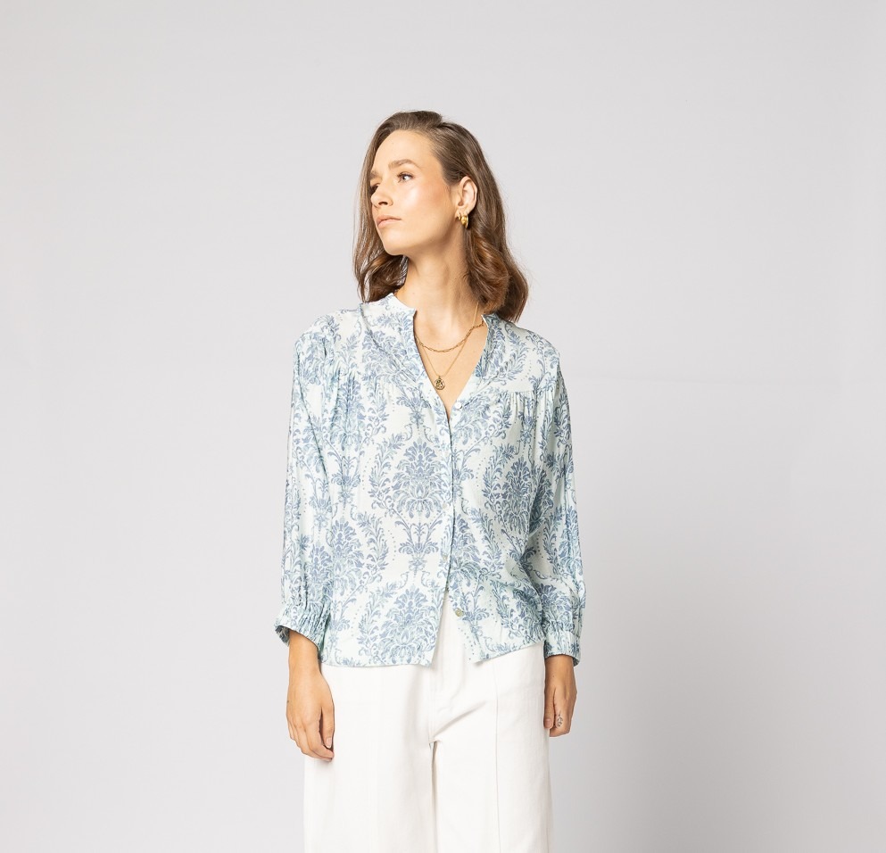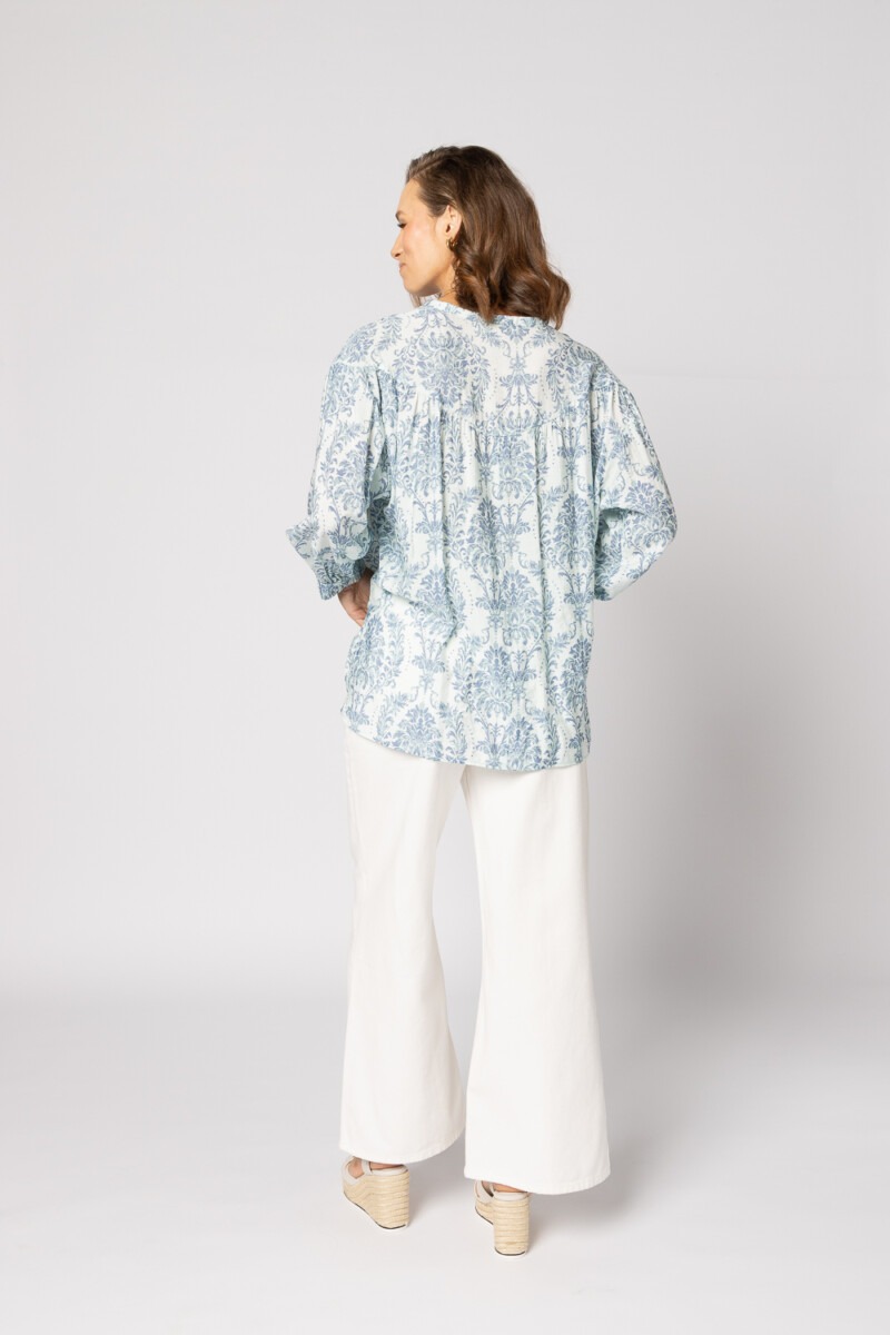 Bloom Blouse from Drama the Label—a captivating long-sleeve blouse designed for elegance and comfort. This exquisite piece features elastic cuffs and a button-front closure, complemented by front and back yoke detailing and a gracefully curved hemline. Crafted from luxurious Tencel nylon fabric, the blouse showcases a striking Damask print that adds a touch of sophistication to any wardrobe
