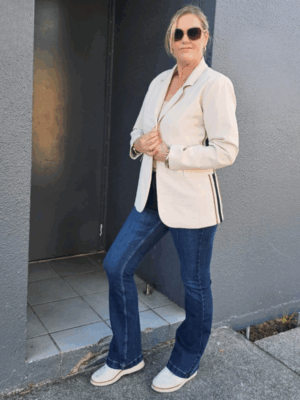 Classic double breasted tailored blazer with a squared hemline and back vent. Featuring contrast side panels and pocket details.