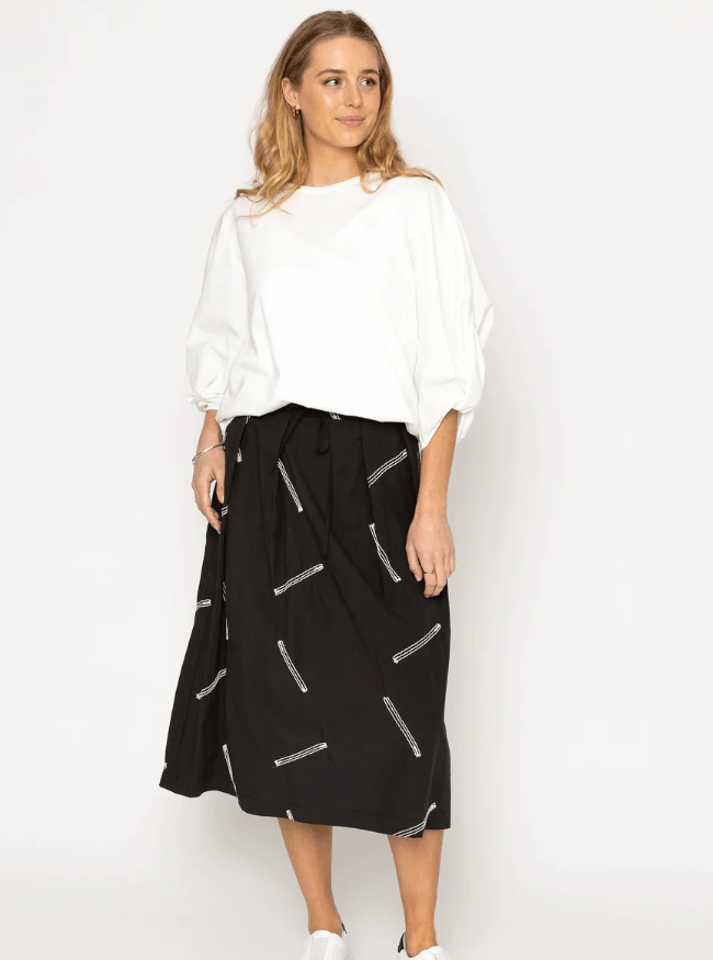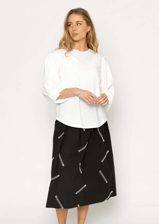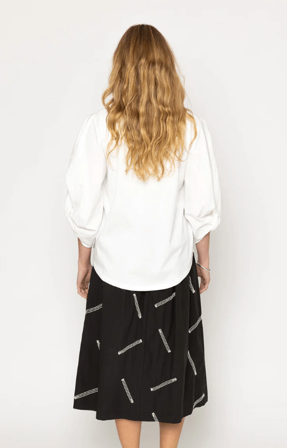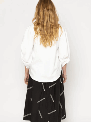 This top features a flattering scoop hem line and elegant puff sleeves with a permanent internal tie for a half-up finish. Elevate any outfit with this sophisticated and exclusive piece, perfect for showing off your unique style.
