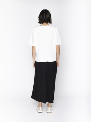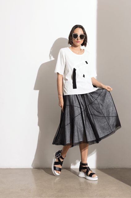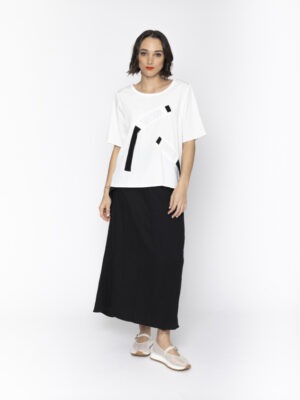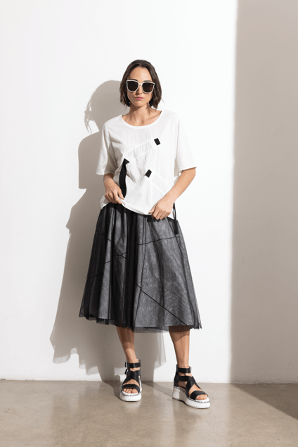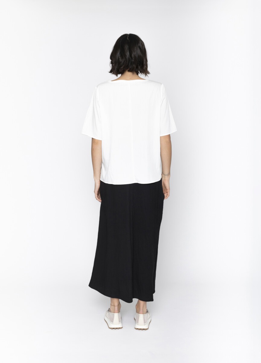 Love a minimalist look? The Dallas top is designed with a simple silhouette but includes a distinctive design element of two contrasting ribbon tabs or architectural trim on the front, which adds visual interest. It has a relaxed, boxy fit that drapes without clinging, offering a comfortable and laid-back style.