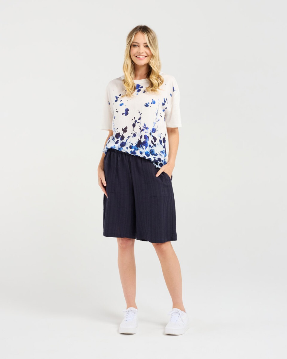 The Delanie Print Front Top from Blackstone is you new go to dressy tee this summer. Featuring a striking print front design together with a linen blend back, this tee encapsulates comfort, style and breathability. Style with shorts for a casual day look or dress up with a skirt and heels for a perfect evening look.