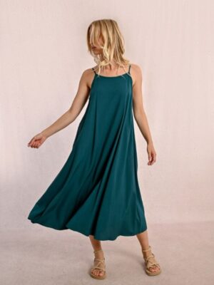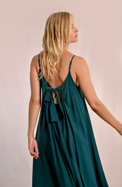 Embrace your French connections with this divine long dress in emerald green. A straight cut style with scoop neckline. Wide bands to tie.