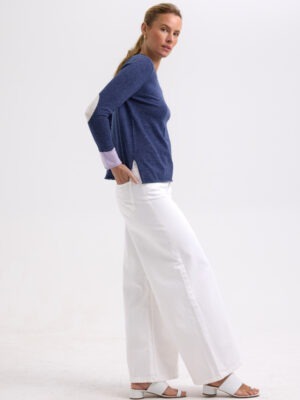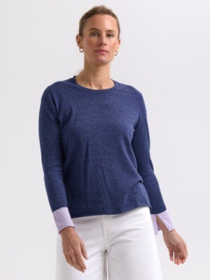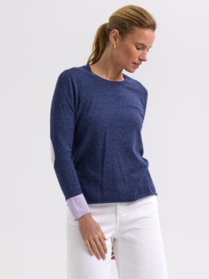 Embrace this beautifully soft spring knit. In a denim blue with lilac cuffs and line through the back, complete with white elbow patches.