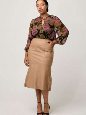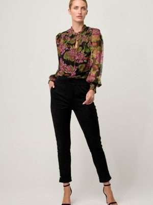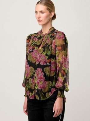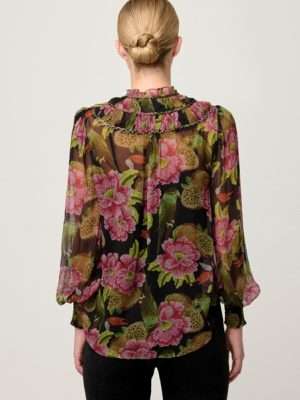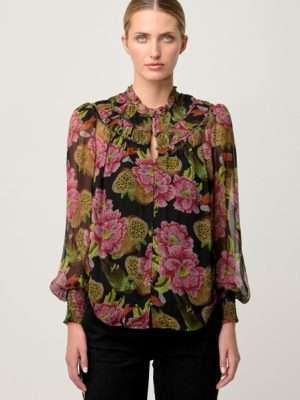 Delicate, romantic, and effortlessly chic, the Estrella Viscose Chiffon Blouse in Winter Granadilla is the perfect fusion of vintage charm and modern femininity. Crafted from lightweight, semi-sheer viscose chiffon, this ethereal blouse features an exquisite floral print, adding a bold yet elegant touch to your wardrobe. The subtle ruffled neckline, dainty button-down front, and billowing sleeves with ruffle-trimmed cuffs create an ultra-feminine silhouette that exudes sophistication and grace. Designed for versatility, the Estrella Blouse transitions effortlessly from day to night—pair it with tailored trousers for a polished office look or style it with denim and heels for a romantic evening ensemble. Whether worn layered over a camisole or styled boldly with a lace bralette, this statement piece is an instant wardrobe favourite.