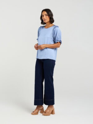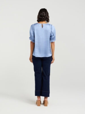 Elevate your everyday with this gleaming viscose-rayon blend top that brings a touch of luxury to any outfit. The smocked frill detailing at the shoulders and short puffed sleeves, adding a playful, feminine flair.. Perfect for pairing with everything from denim to skirts, it’s an effortless way to add a dash of elegance to your wardrobe.