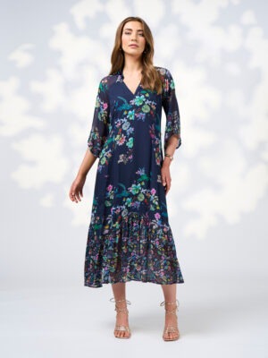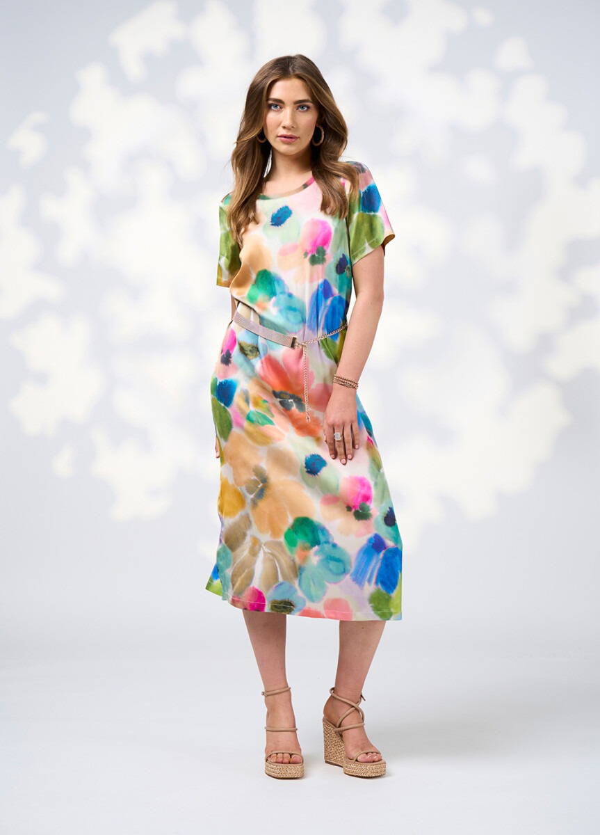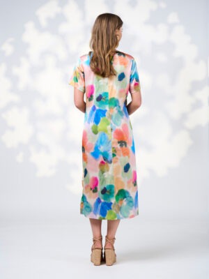 A luxe t-shirt dress, made in a silky printed stretch viscose. Using a matching rib neckline. With bust darts, back neck opening and side splits to elevate.