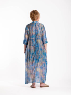 This dress is a wardrobe must this summer with its classic and timeless silhouette. The dress features, soft grandpa collar stand. With dart detailing at hem creating a beautiful voluminous tulip shape. Insert side pockets. Stitch detailing across the front body including pleat work. Wear simply with statement dress or style with a fitted tunic underneath and use it as a duster coat to finish your look.