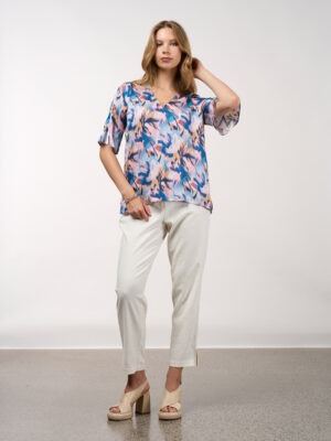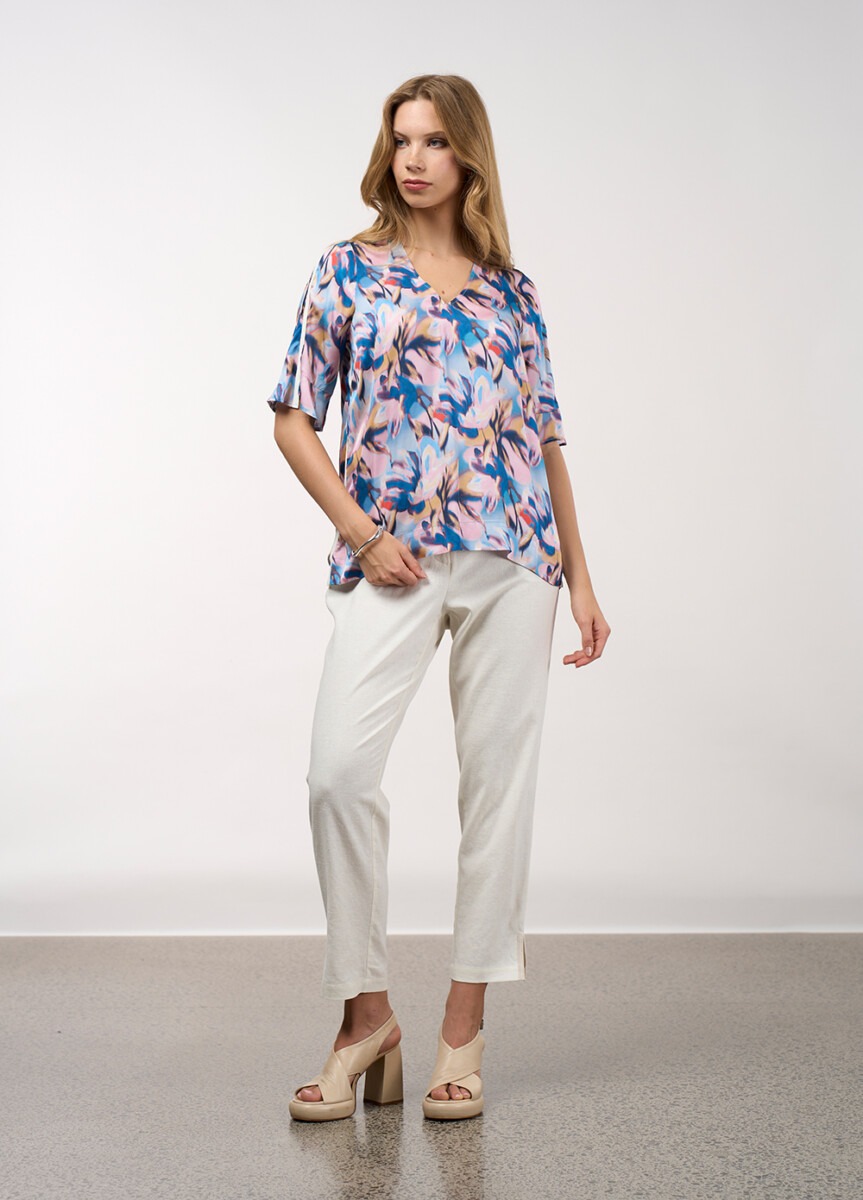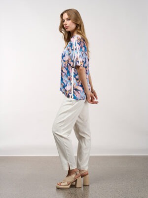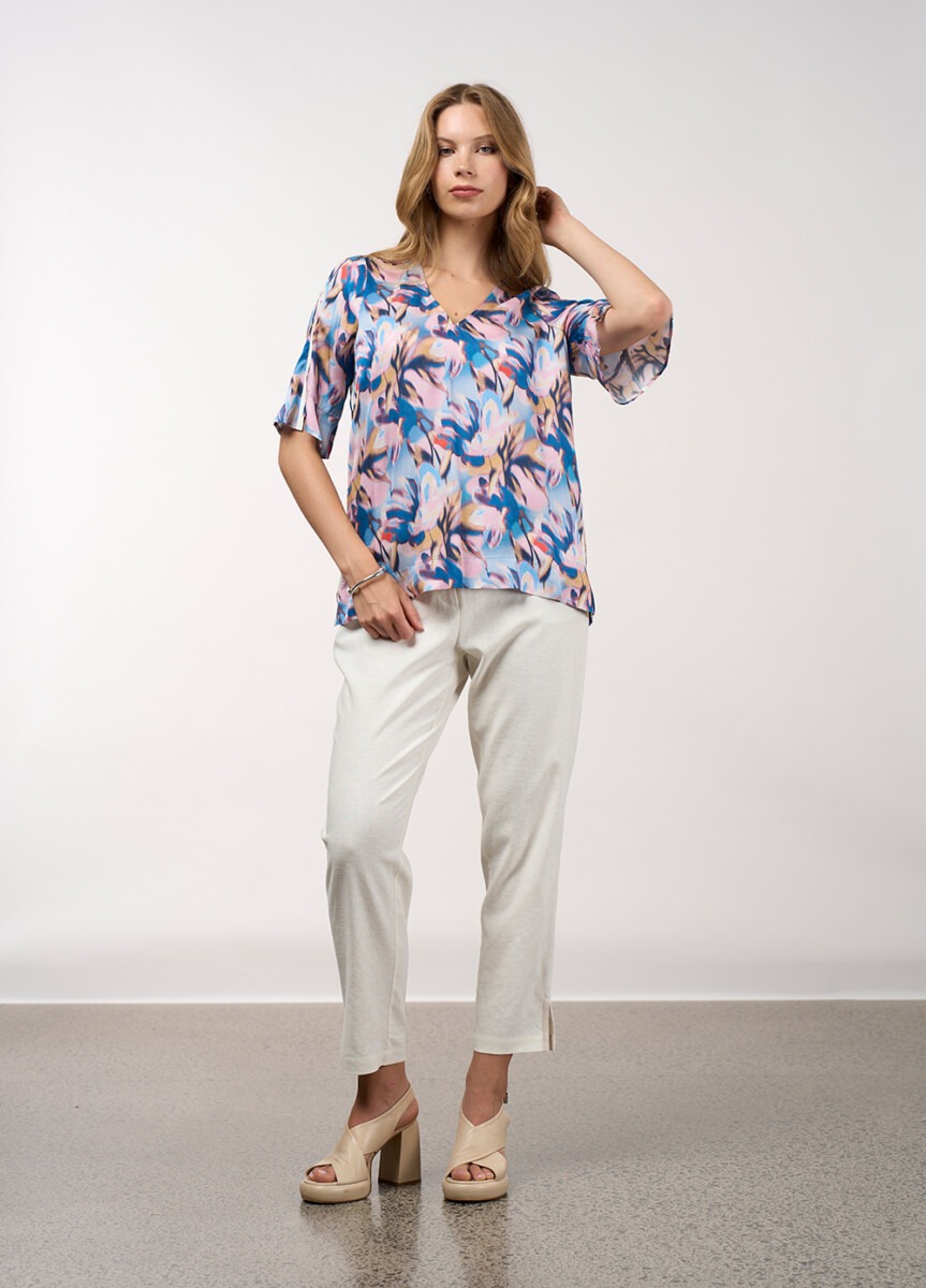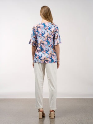 Elevate your spring wardrobe with the Fyrefly top. A printed V neck top with delicately fluted sleeves. Featuring contrast detailing at side seam and running from the shoulder down the outer sleeve. Splits at the sleeve opening and garment hem provide interest and ease of fit.