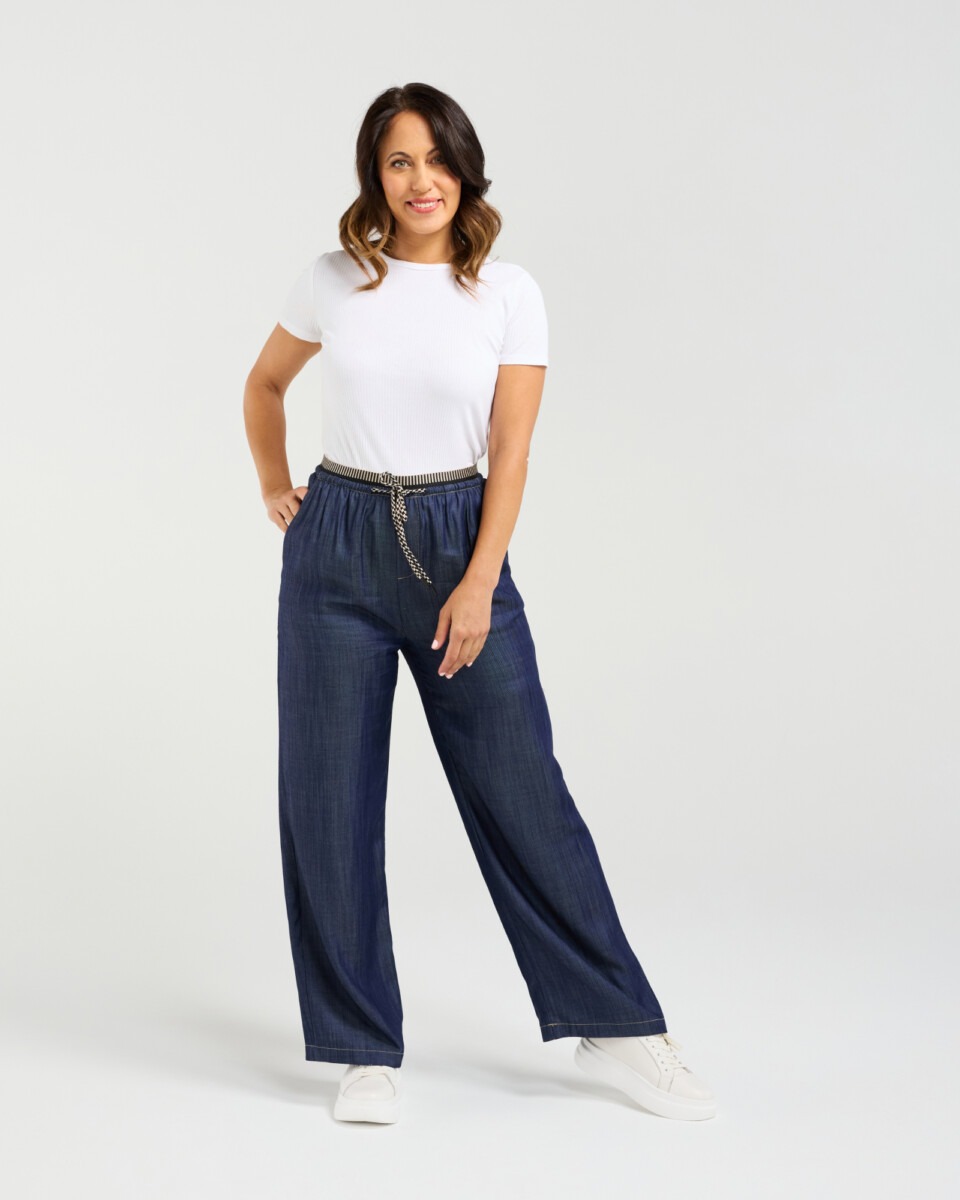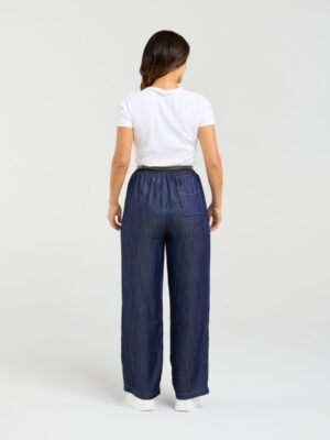 These relaxed loose-leg pants are designed for comfort and effortless style, featuring an elastic trim at the waistband with a contrast tie for an adjustable fit. The easy silhouette drapes softly, offering freedom of movement and a laid-back yet polished look. Perfect for everyday wear, travel, or lounging, these pants combine versatility with relaxed sophistication.