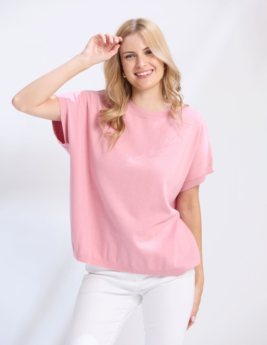 A beautiful crew neck basic knit top, in jersey knit. With fine ribbed trims. In a soft pink colour.