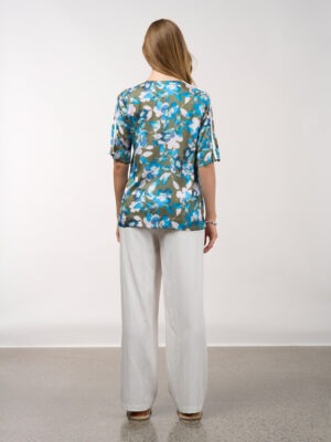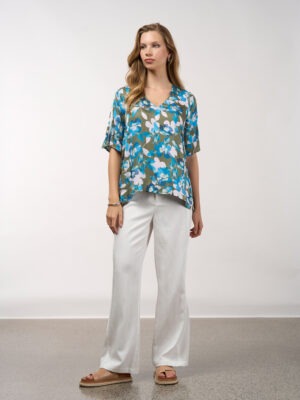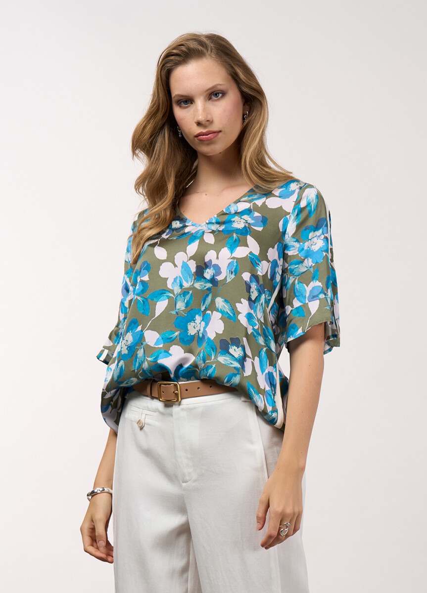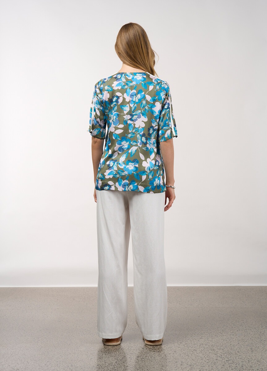 Elevate your spring wardrobe with the Haiku top. A printed V neck top with delicately fluted sleeves. Featuring contrast detailing at side seam and running from the shoulder down the outer sleeve. Splits at the sleeve opening and garment hem provide interest and ease of fit.