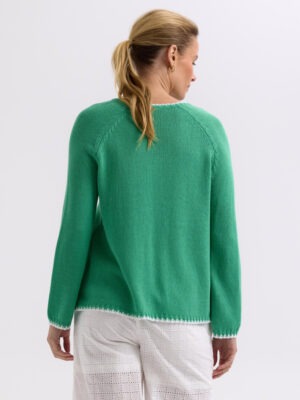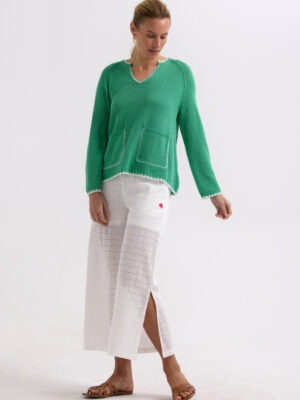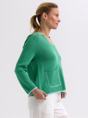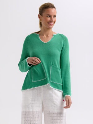Green is in, and we’re here for it! Layer up with this sweet apple coloured spring knit. In an A-line style, front patch pockets and V neckline.