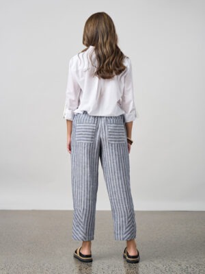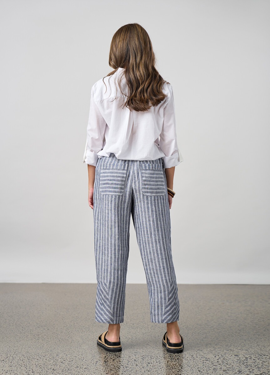 Yes to these! A flattering navy stripe linen pant for your summer wardrobe. This tulip styled pant with an elasticated waist and flat front for a perfect fit. Features side hem panels with angled stripe. Pockets also feature alternative stripe direction for a detailed difference.