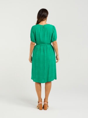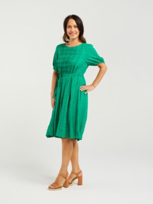 This knee-length dress offers a relaxed yet polished look with a smocked front bodice and elasticated short sleeves for a comfortable fit, and a self-tie detail around the waist, ensuring effortless style and versatility for any occasion.