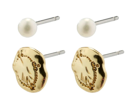 It’s all in the details. With the gold-plated 2-in-1 set from Pilgrim, you get 2 pairs of small elegant ear studs for your stylish everyday looks. The white freshwater pearls create a simplistic and romantic piece, while the matching gold-plated studs have a handcrafted feel with irregular shapes and a nature-inspired embossed surface.