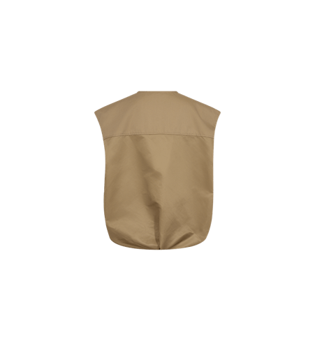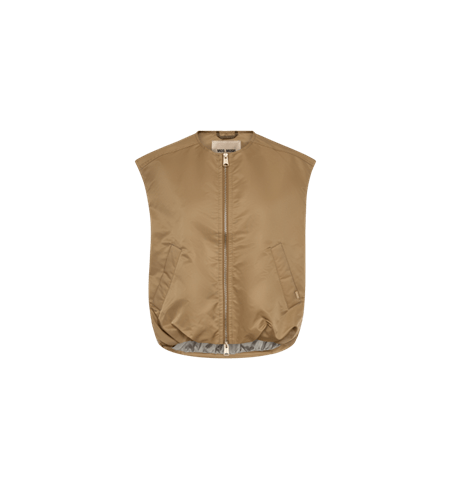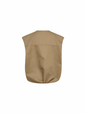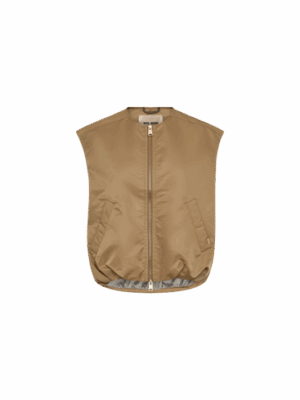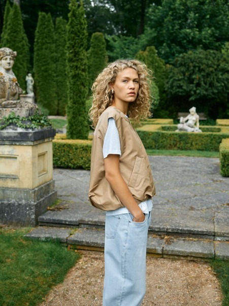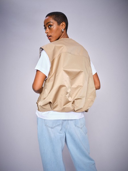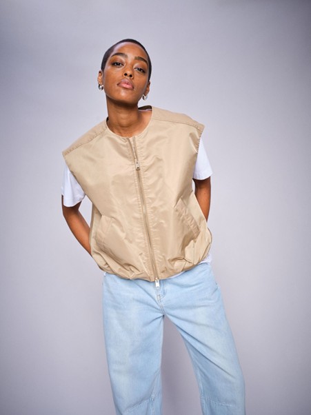 This voluminous waistcoat features an elasticated bottom for a bubble effect, complemented by a two-way zipper and slant side pockets. Perfect as a transitional piece, it pairs effortlessly with vintage wash denim and a simple white tee for a laid-back, stylish look.