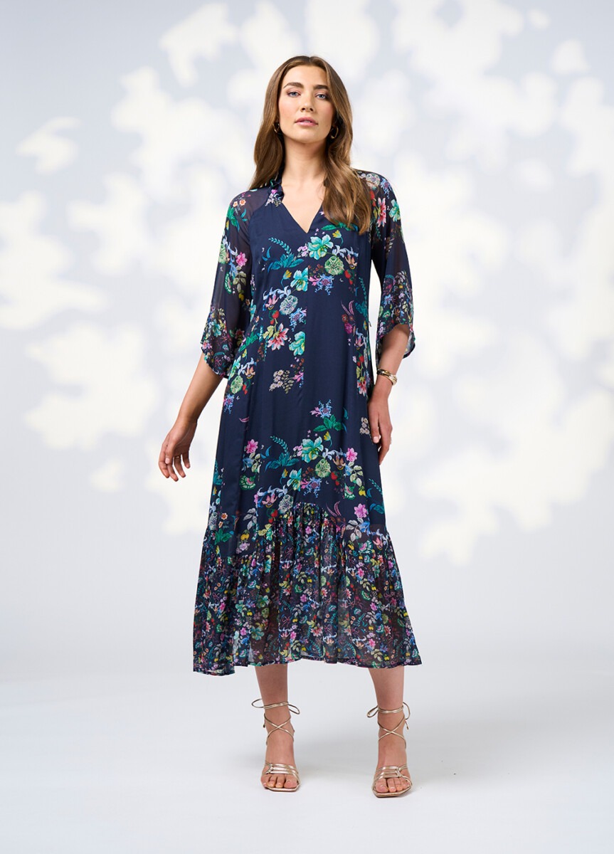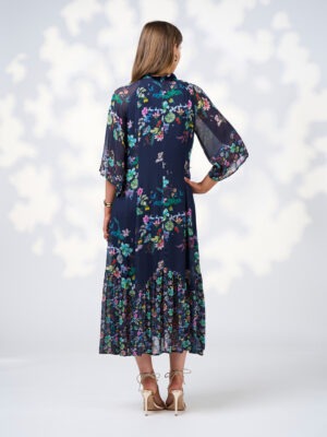 Featuring curved hem panels with contrast print, contrast hem on sleeves emulates this curved hem. Fully lined. Comes with matching belt.