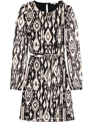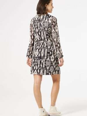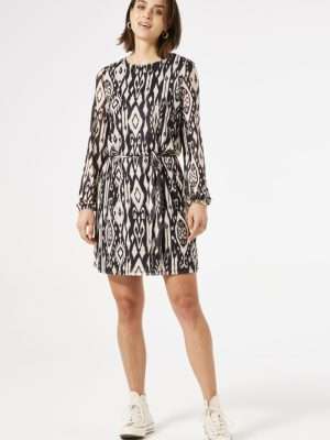 Dress with allover print. A real eye-catcher! This dress has long sleeves, a round neck, a waist belt, and a regular fit. This item is made of 50% recycled polyester, 45% polyester, and 5% elastane.