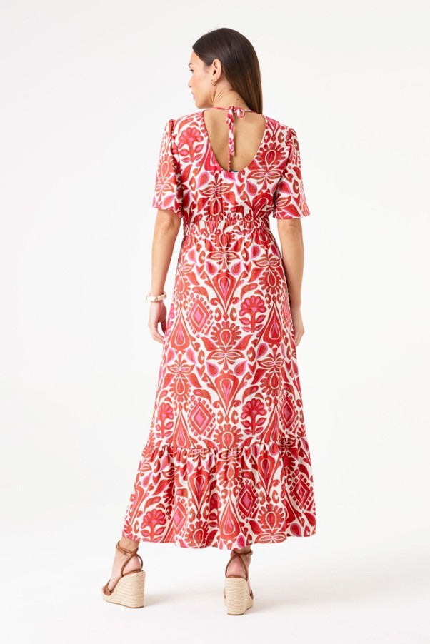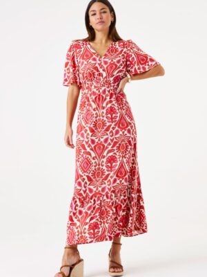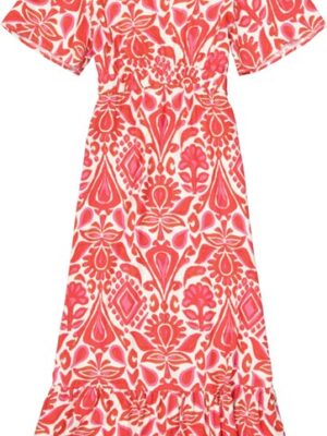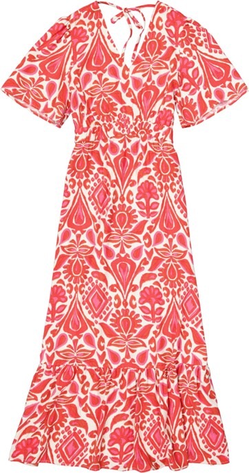 Allover print dress. Ideal for a trendy look. This dress has short sleeves, an elastic waistband, a V-neckline, and a relaxed fit. This item is made of 100% viscose.