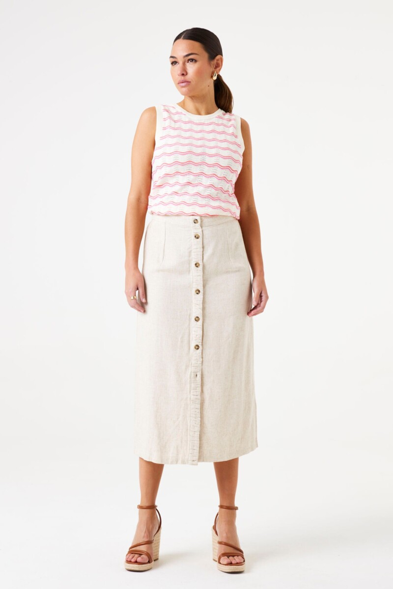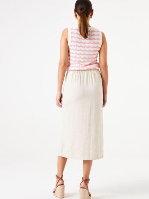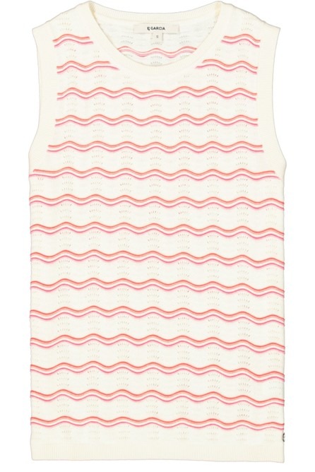 Knit top with eyelet and striped pattern. A nice, comfortable item. This top has a round neck and a regular fit. This item is made of 100% cotton.
