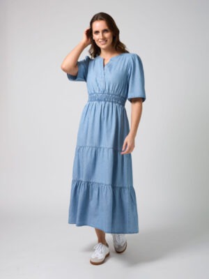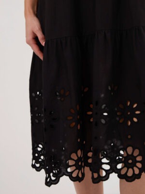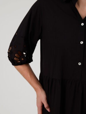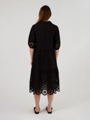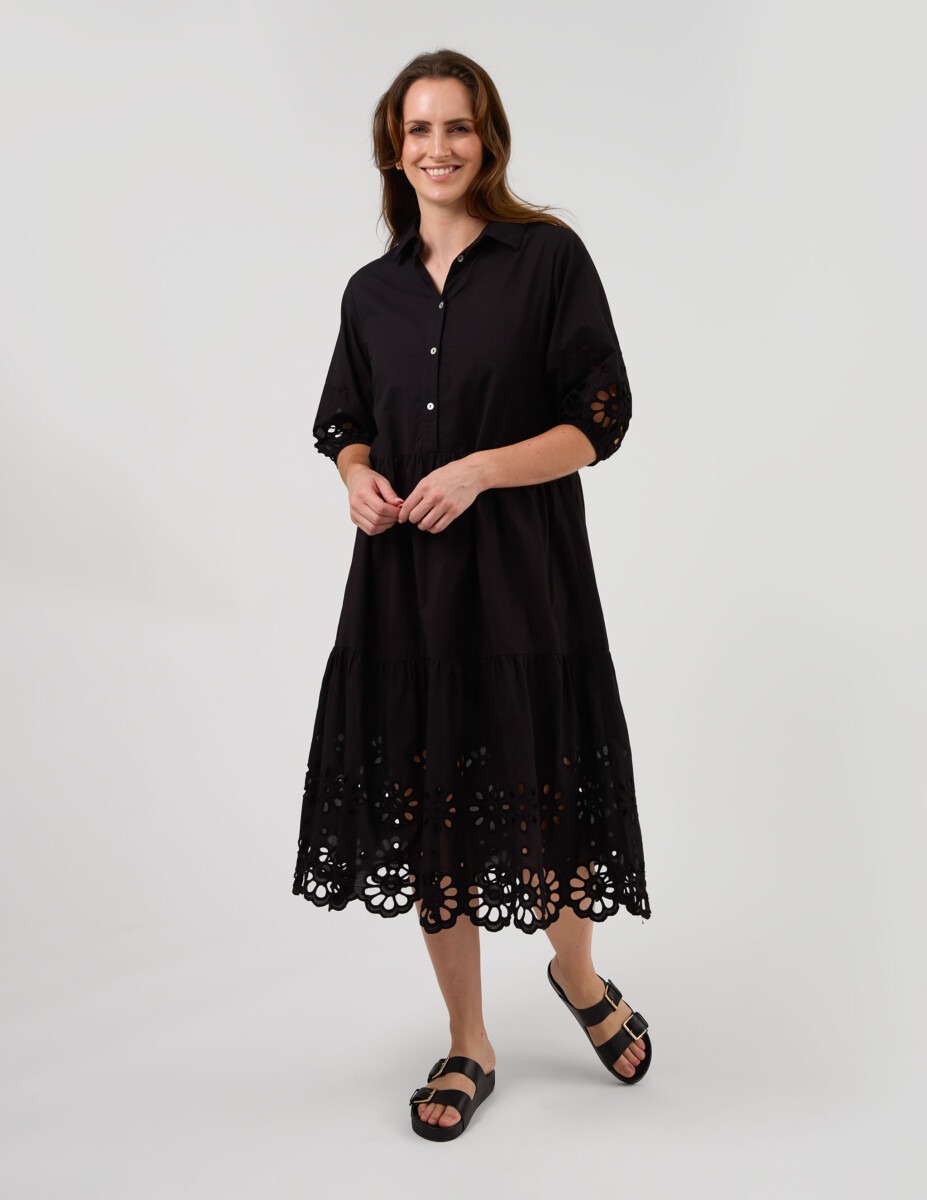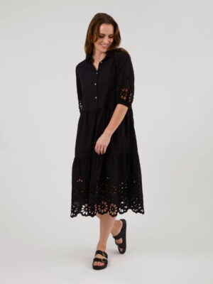 Love black? Love boho styles? The Lainey dress is for you this summer. A midi length collared tiered dress with button front upper bodice detail. Open broderie detail on billowing sleeves and hemline. Elasticated sleeve cuffs and detachable slip lining, divine!