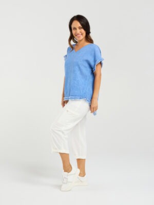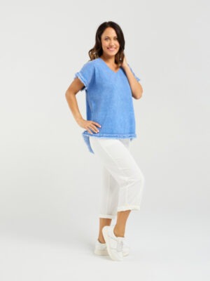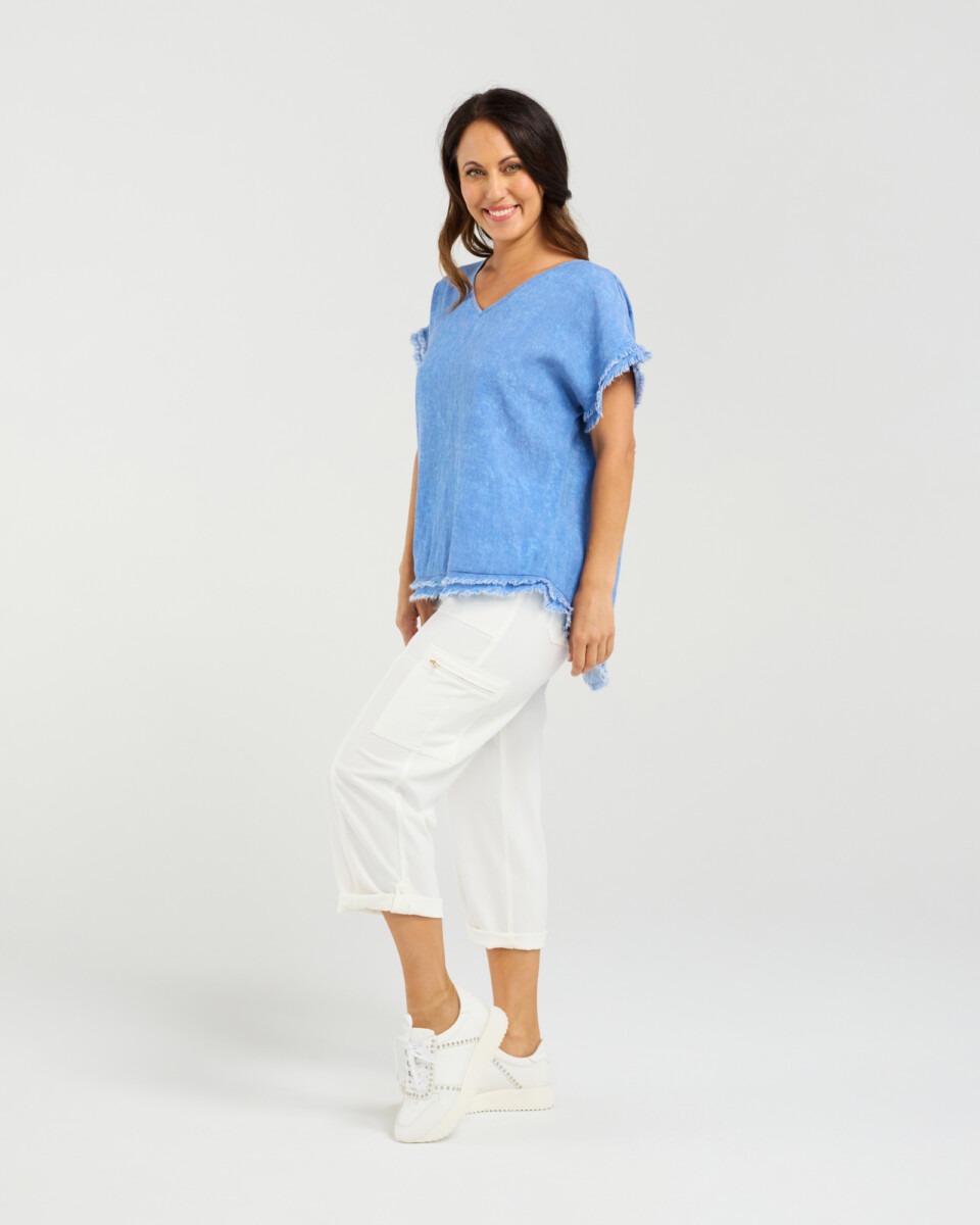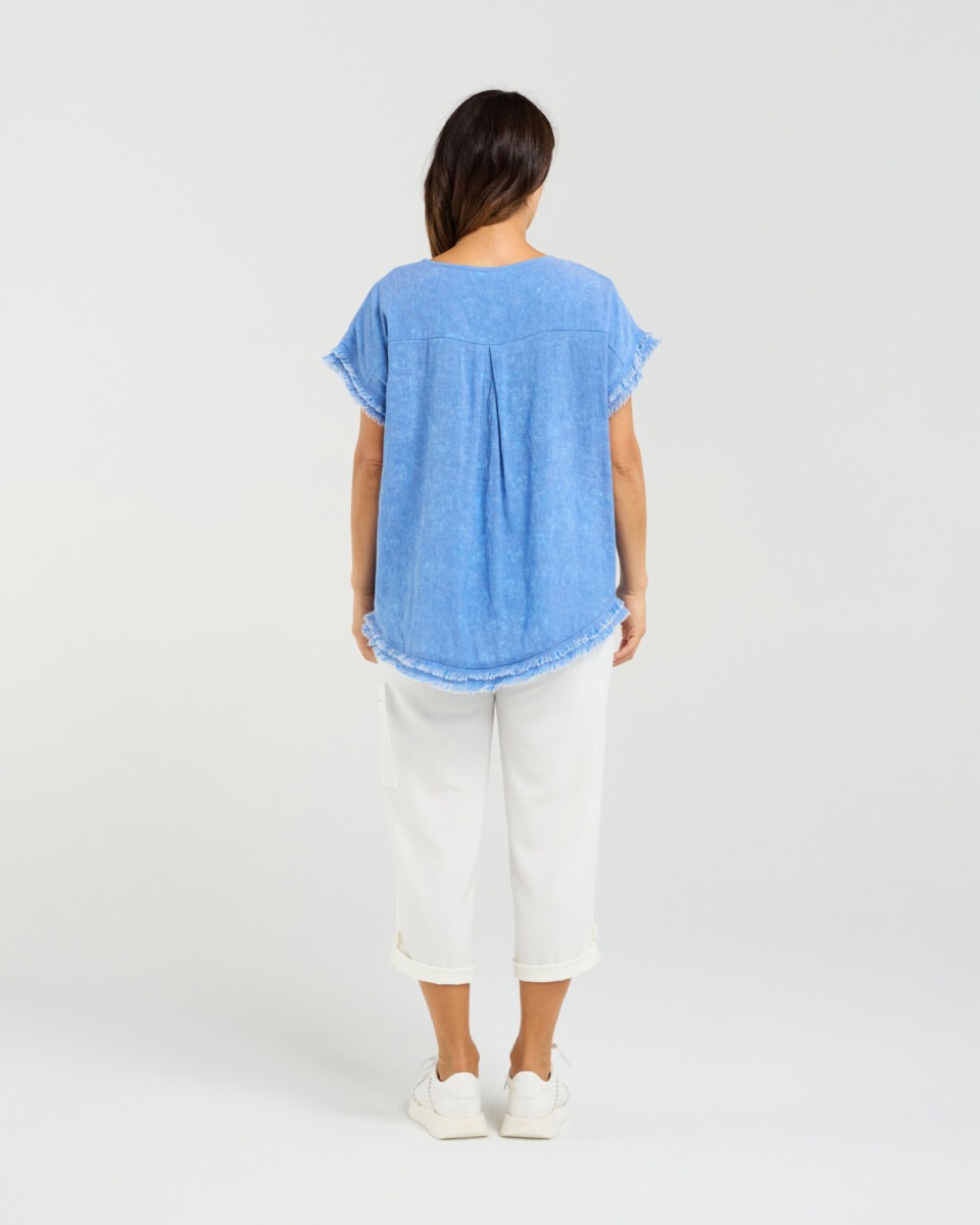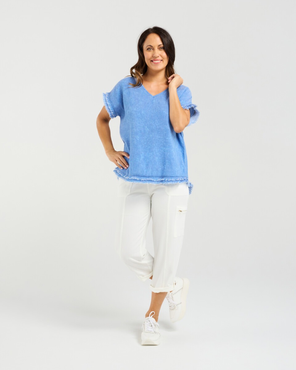 This soft blue V-neck top blends simplicity with subtle texture. Short sleeves and a gently relaxed fit make it an easy everyday piece, while frayed detailing on the cuffs and hem adds a lived-in, romantic edge. The raw finishes give it a casual elegance, perfect for layering or wearing solo on breezy days.