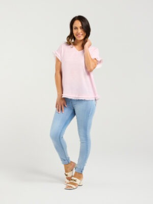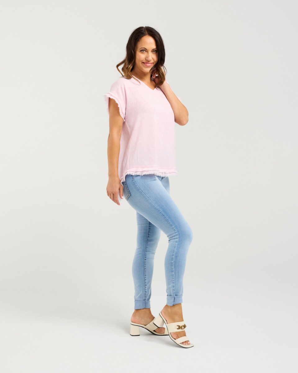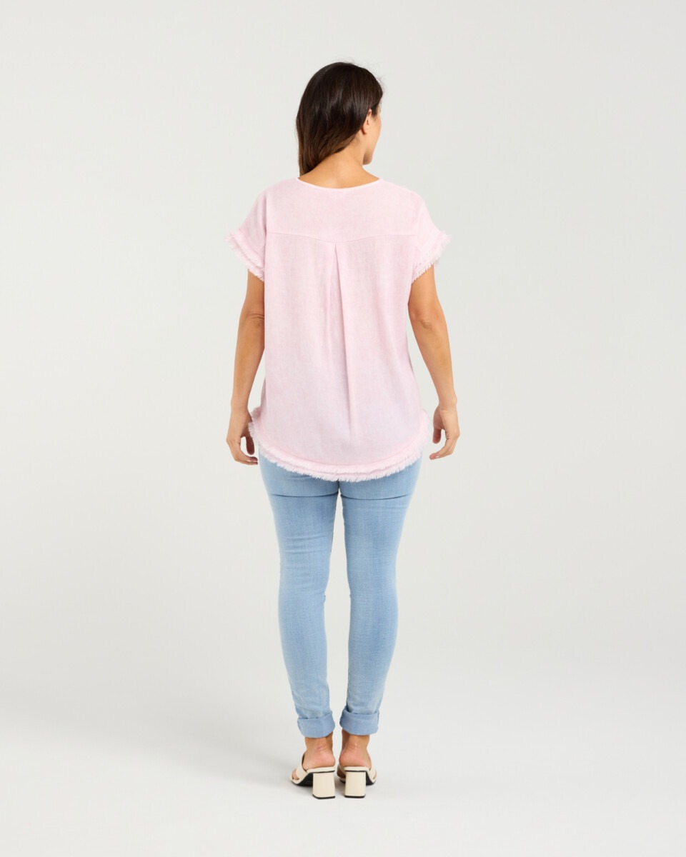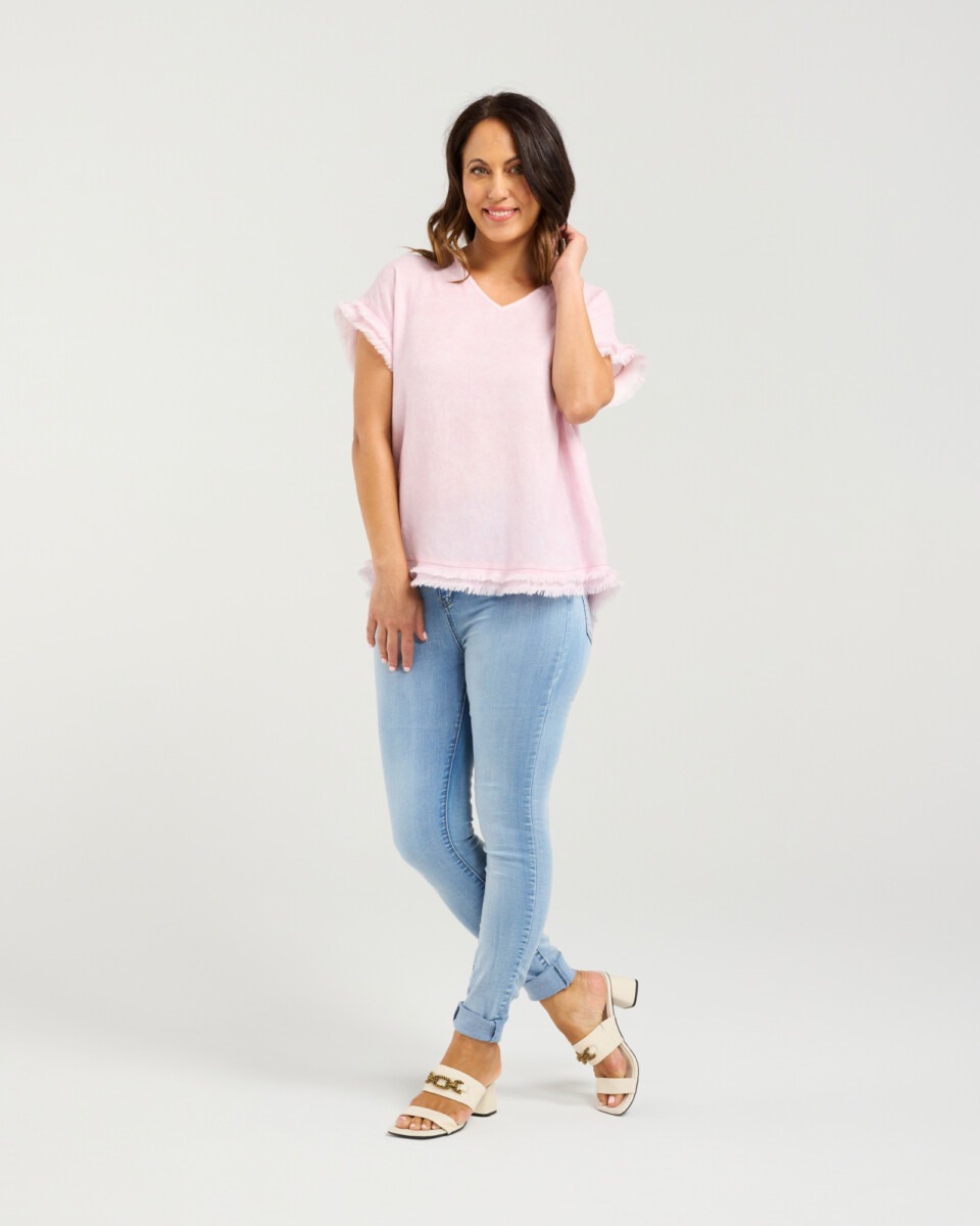 This soft pink V-neck top blends simplicity with subtle texture. Short sleeves and a gently relaxed fit make it an easy everyday piece, while frayed detailing on the cuffs and hem adds a lived-in, romantic edge. The raw finishes give it a casual elegance, perfect for layering or wearing solo on breezy days.