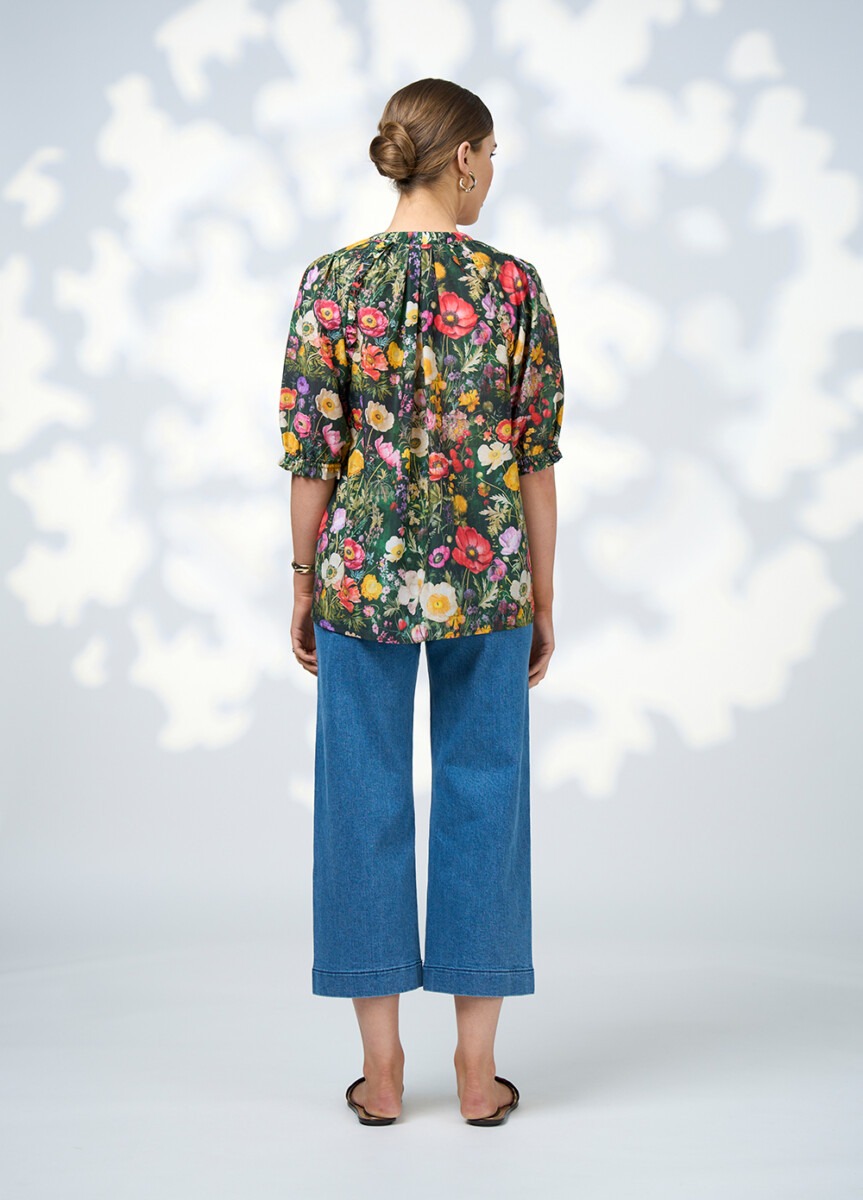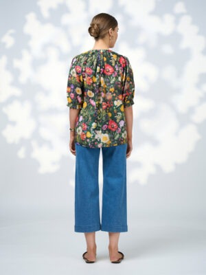 Silk cotton voile top with rushed V neckline and ruffle raglan sleeves. Floaty silhouette is accentuated with tuck detailing.