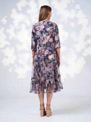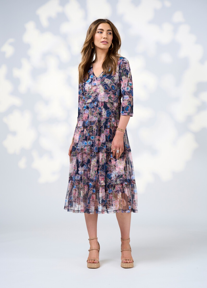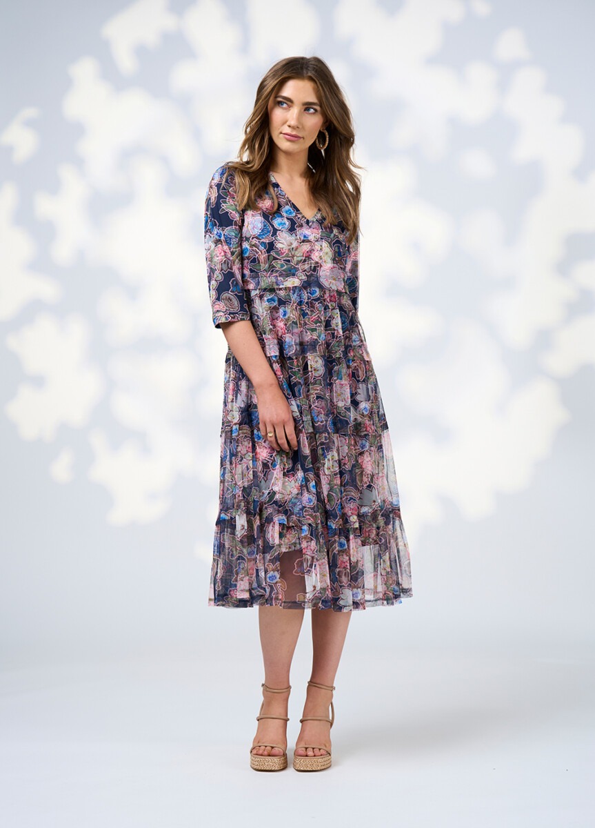 Printed tulle dress with 3/4 length sleeves and V neckline. Gathered tieres feature a tuck at top edge of seam.