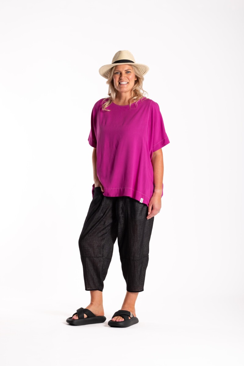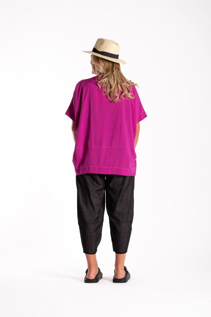 Simplicity meets sculpture in the Magnolia Top. With angled side seams and a curved hemline, this top brings subtle movement and shape to a classic silhouette. The back features a softly draped panel that creates a flattering arc effect — gently cinching without clinging. Clean, wide sleeves and a crew neckline complete the look, making this a wardrobe staple with a design twist.