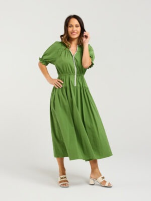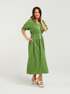 Green dress is defined by its delicate detailing and flattering shape. A gently elasticated waistline cinches the silhouette, while white lace trim along the neckline adds a sweet, nostalgic accent. Short sleeves with elasticated frilled cuffs enhance the airy, feminine feel. Easy to wear and effortlessly graceful.