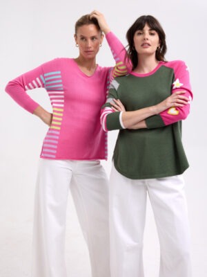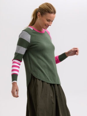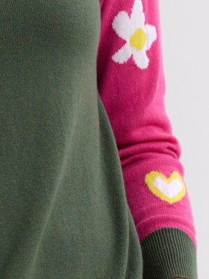 A beautifully soft knit. In an earthy khaki colour with fun pink and khaki sleeves, in stripes and flowers.