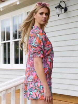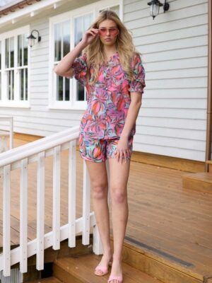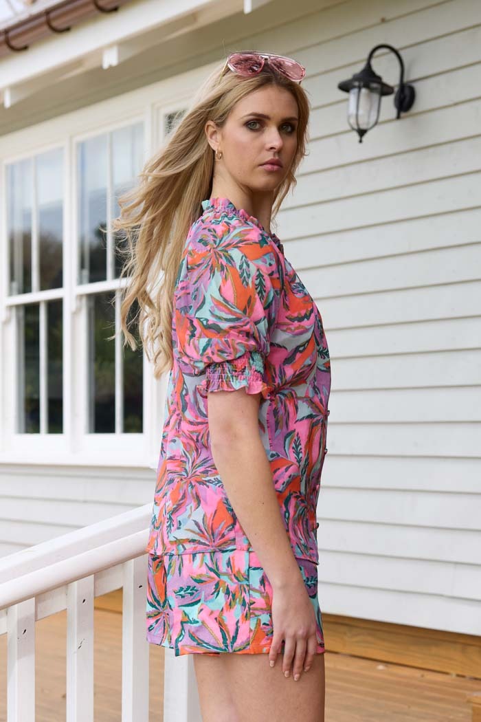 The Nessa Chiffon Blouse brings a touch of tropical charm in a dreamy pink palm print, infused with soft purple and teal tones. Crafted in floaty chiffon, it drapes beautifully with a relaxed yet refined silhouette. The short sleeves feature elasticated, ruched cuffs for a feminine finish, while the button-front design adds a classic touch. Fully lined for comfort and ease, this blouse transitions effortlessly from day to evening with polished versatility.