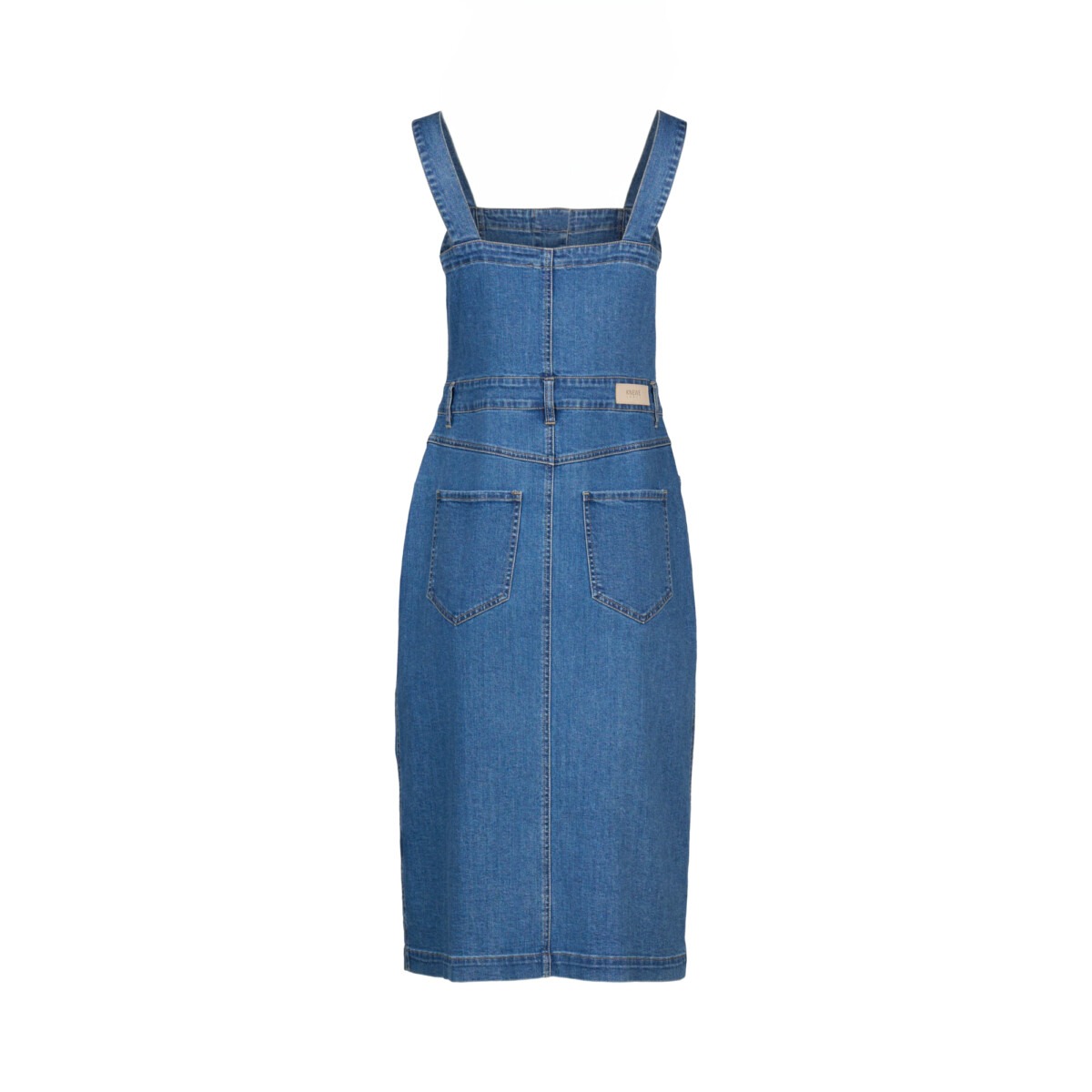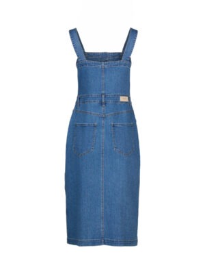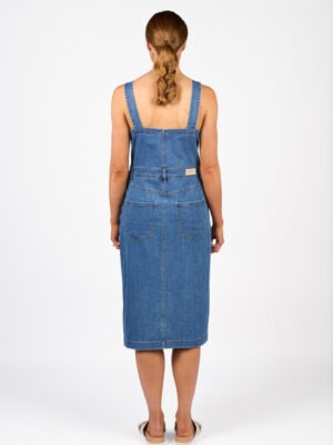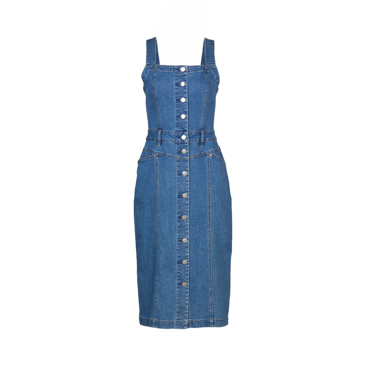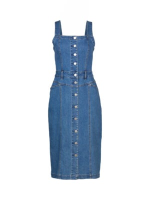 The Novel Dress is a sleeveless denim style with a straight neckline and metal button-up front. Made from stretch denim in a flattering midi length, it’s shaped through the body to create a structured yet easy silhouette with a casual edge.