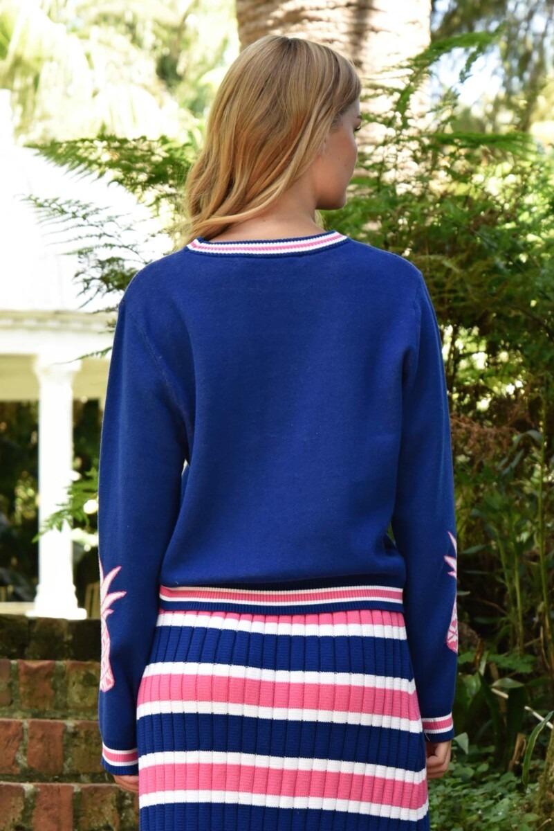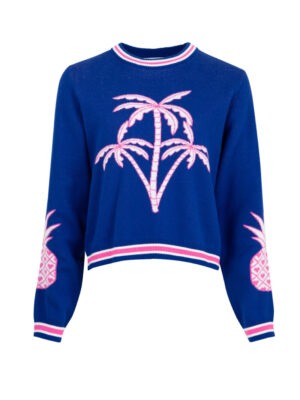A soft cotton knit and a bold print come together to create the ‘Palm Before the Storm’ sweater. Crafted in the ‘Knitty Gritty’ cotton knit fabric, this soft hand-feel sweater features a palm and pineapple motif on the front and sleeves.