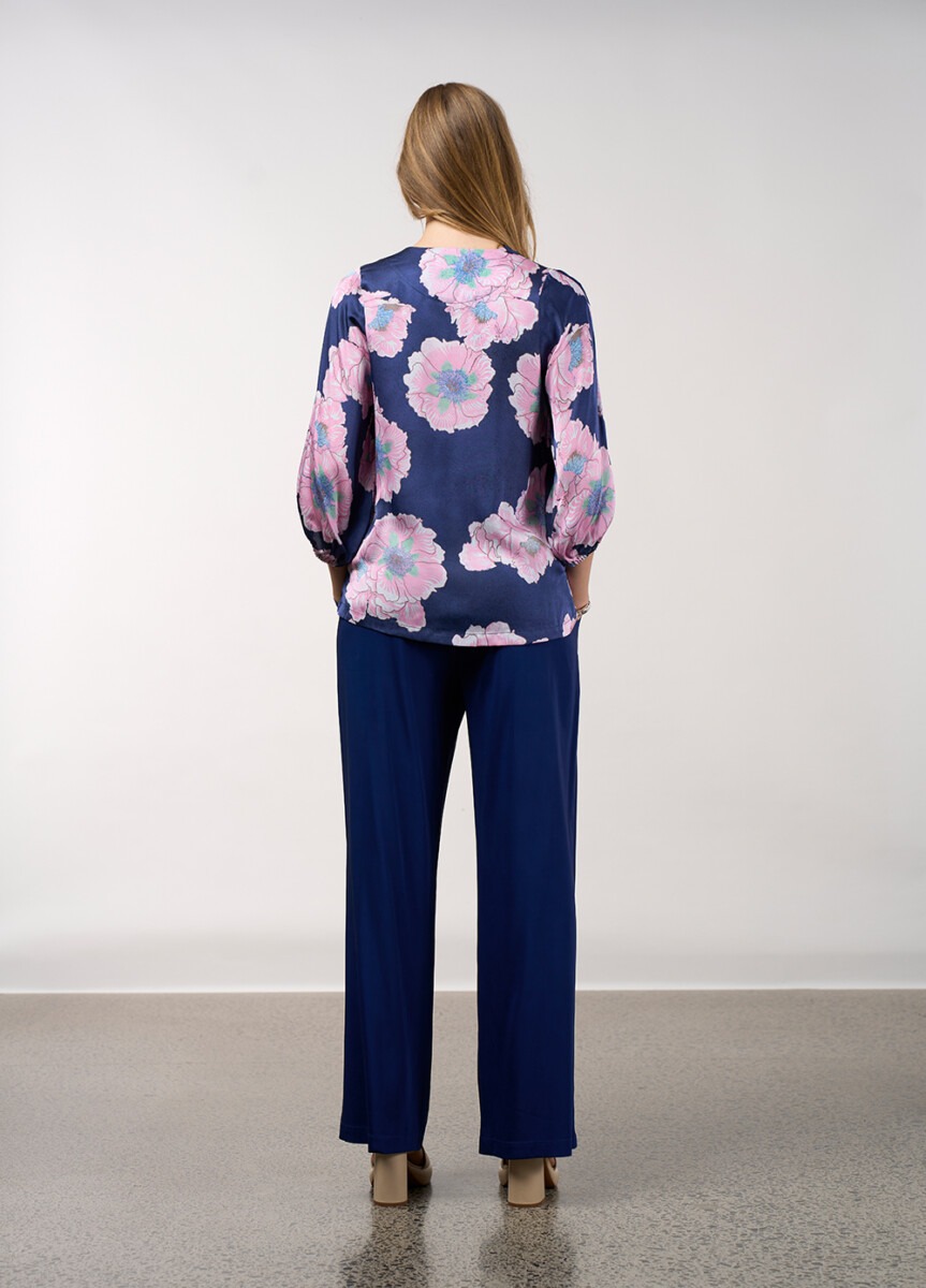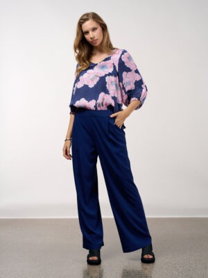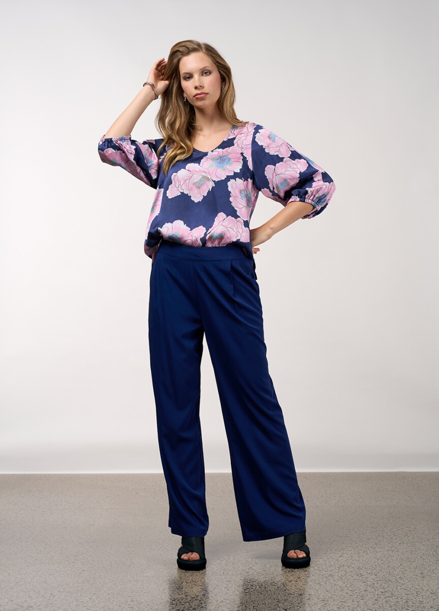 A printed top with a rounded V neckline, featuring 3/4 length blouson sleeves gathered into an elasticated cuff and side splits for ease of fit.