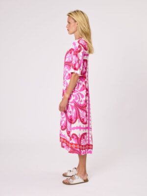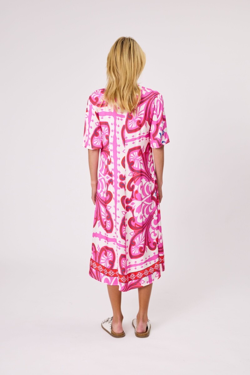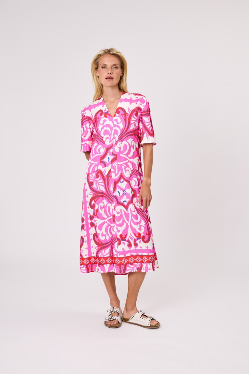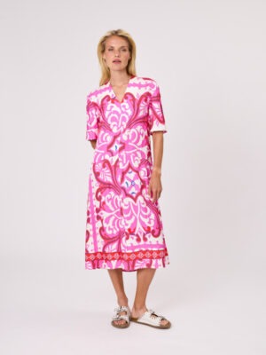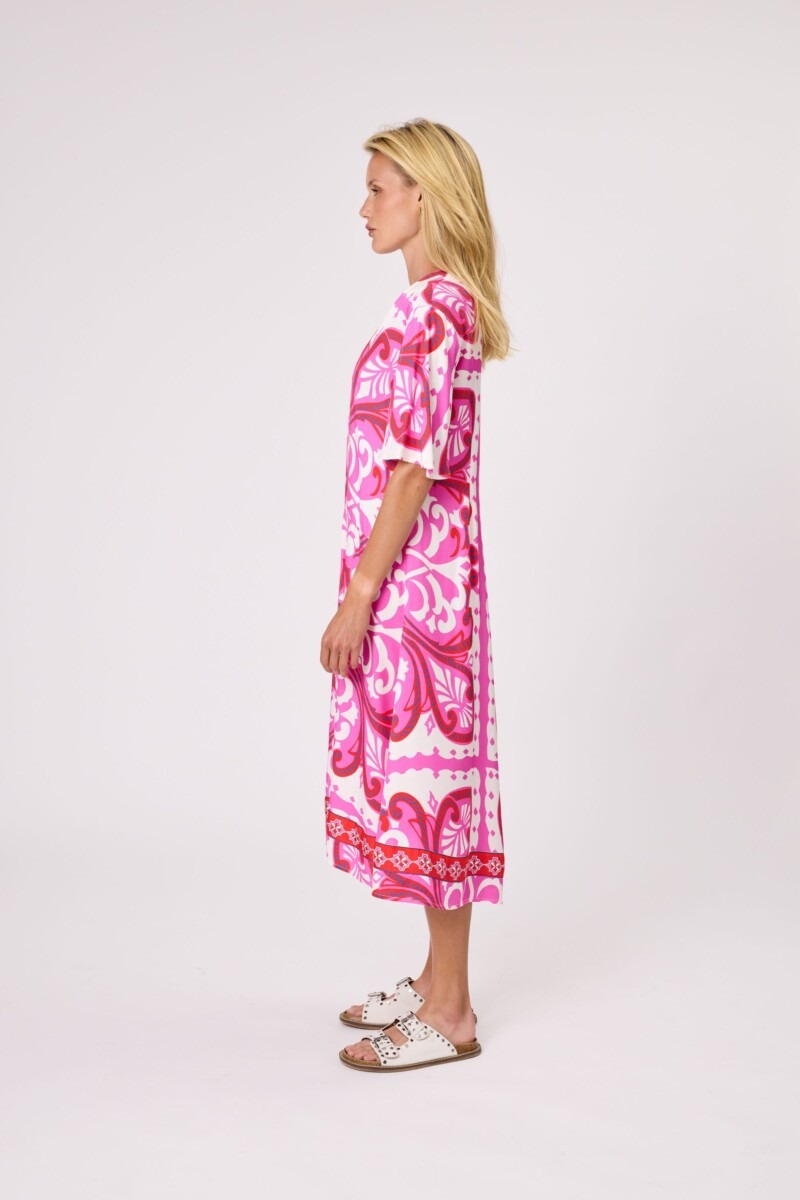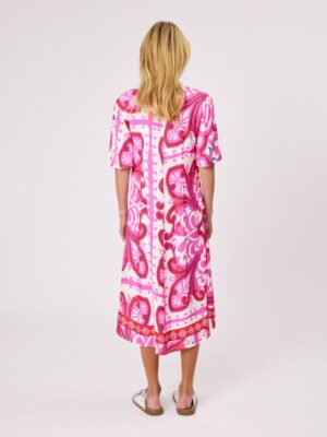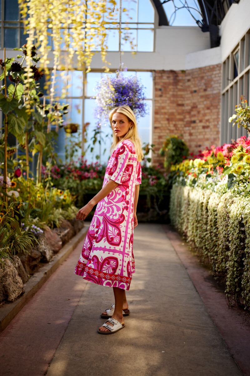 A vibrant statement in the all-over Saint print, this mid-length dress is crafted from soft, drapey viscose for a beautifully fluid fit. Featuring a flattering V-neckline and set-in sleeves, it’s designed for both comfort and style. Finished in a bold, beautiful pink — perfect for brightening any day.