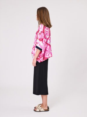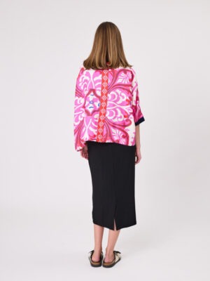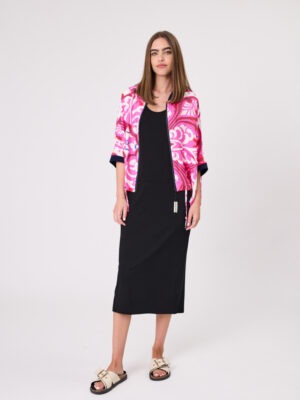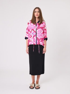 The drop-shoulder Saint Print Jacket is crafted from soft, flowing viscose for effortless comfort. It features ribbed neckline and cuffs, a sleek single-ended zipper front, and practical patch pockets. Adjustable ties at the hem allow you to customize the fit, combining style and function in one bold print.