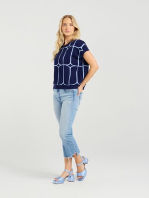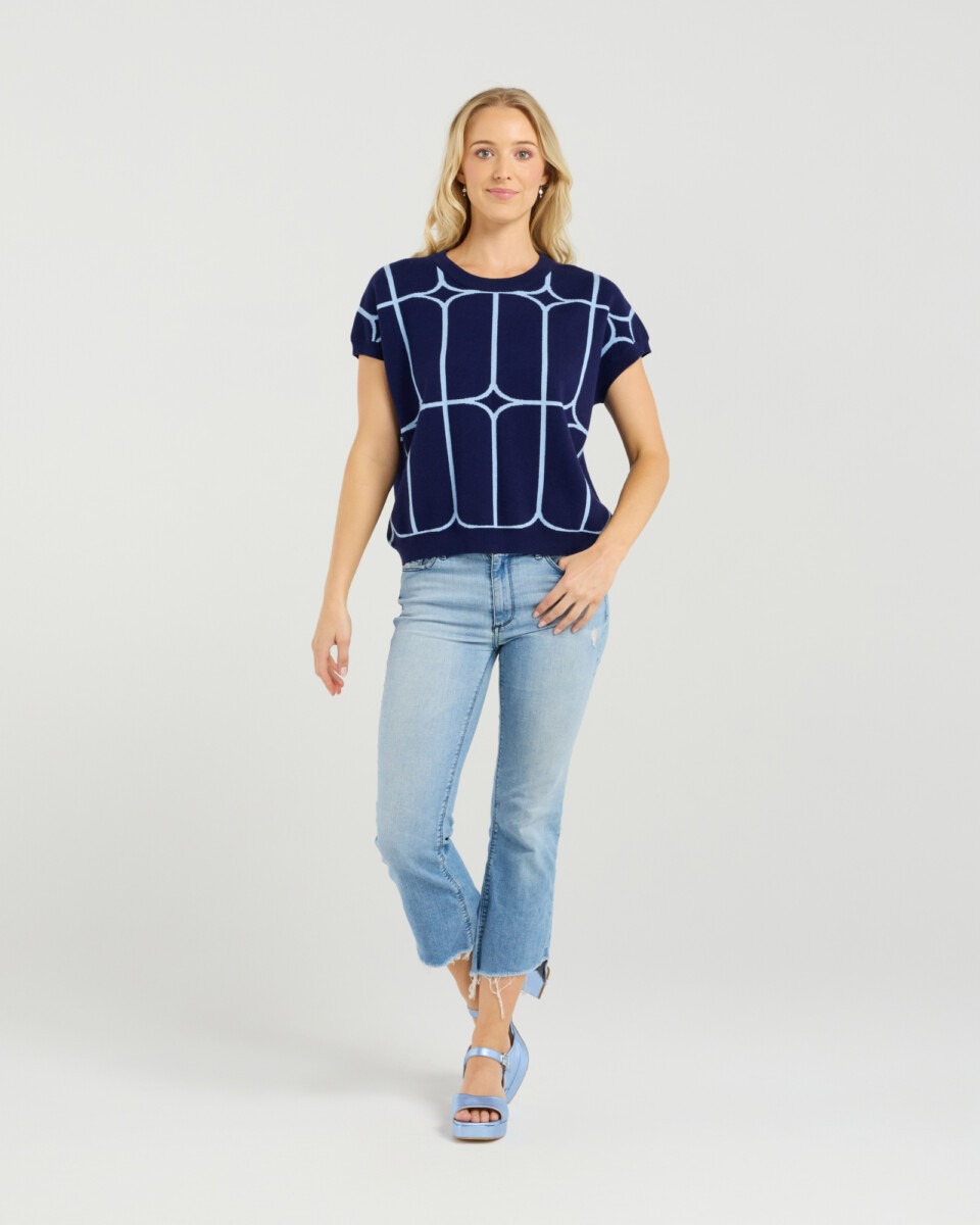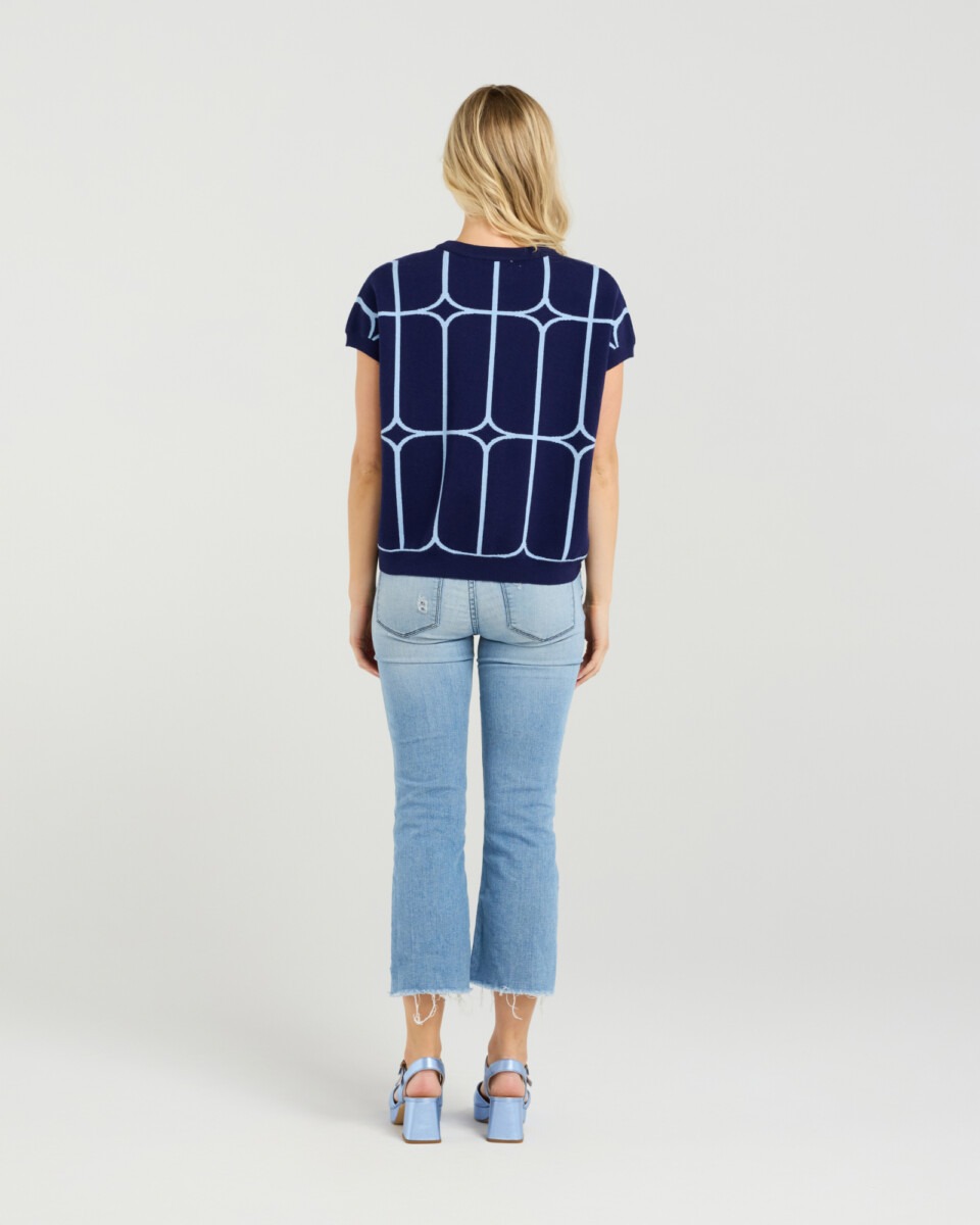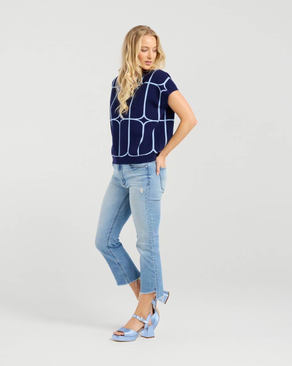 Effortlessly refined, this summer-ready knit vest is a warm-weather essential with a modern twist. Crafted in a soft knit, it features a striking contrast trellis pattern that adds graphic dimension and texture. Perfect for layering over a crisp shirt or styling solo with tailored shorts, this vest balances structure and softness for a polished yet relaxed look.