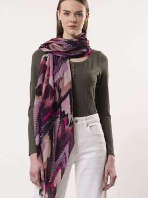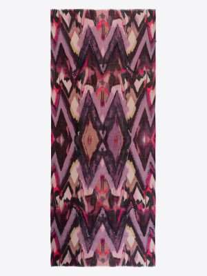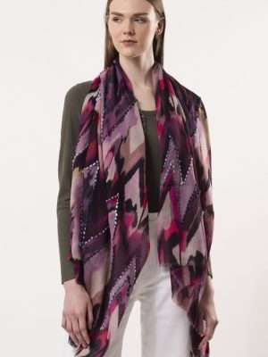 The SIENNA scarf is a stunning fusion of art and texture, featuring a painterly chevron digital print enhanced with intricate handmade cord embroidery for added depth and sophistication. Crafted from 100% soft wool, this oblong scarf is designed for effortless draping and finished with delicate small fringes.