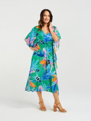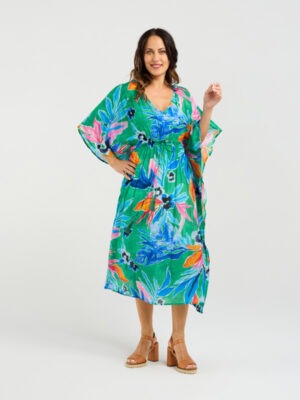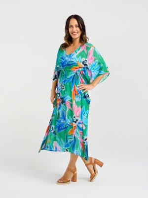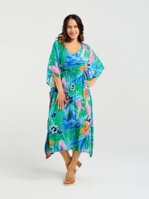This breezy kaftan features a relaxed silhouette brought to life by a vibrant tropical print, evoking a sense of effortless vacation style. Designed with a waist tie for adjustable shaping, it flatters the figure while maintaining a flowy, laid-back feel.