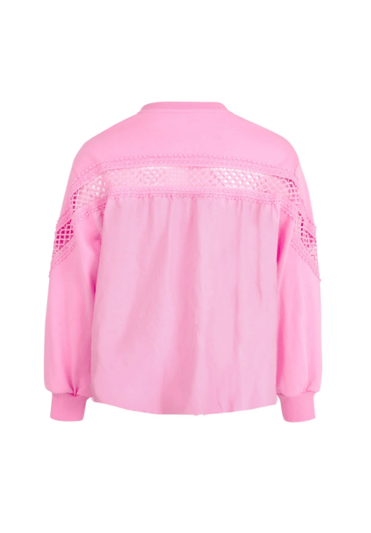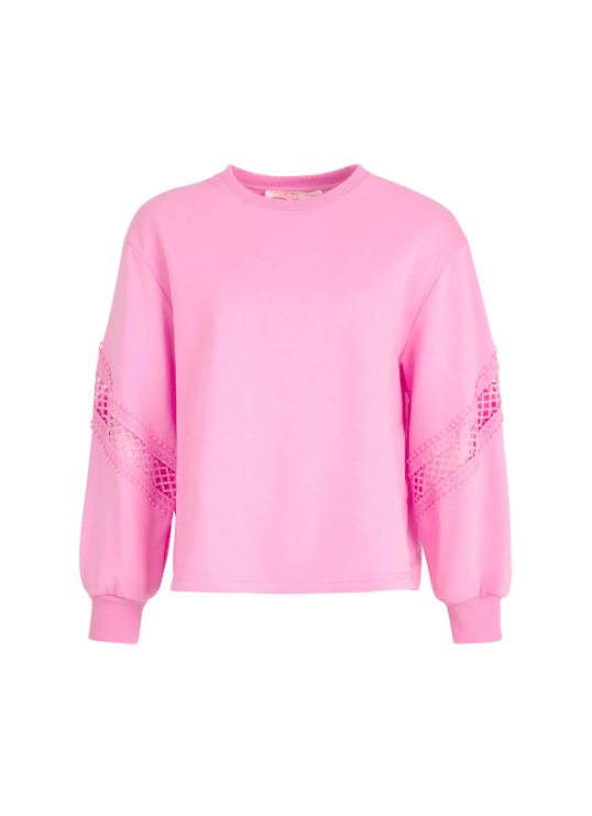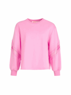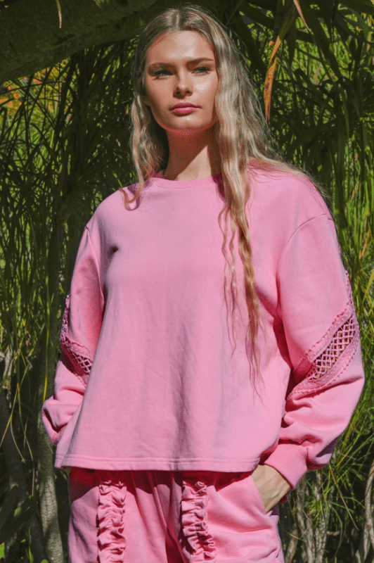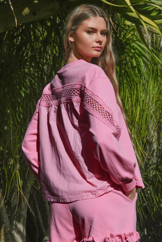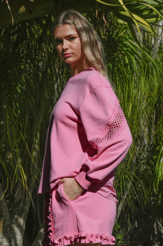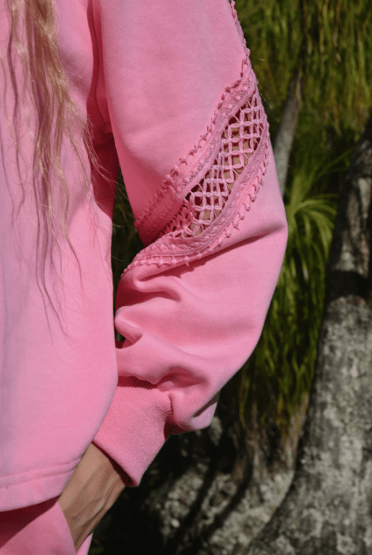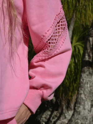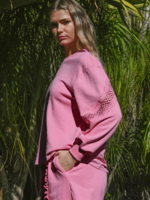 Promoting sport-luxe, the ‘Sweater than Honey’ sweatshirt grants comfort and style for weekend lounging. Crafted in the ‘No Sweat’ cotton sweatshirting, this piece sports a relaxed fit through the body with generous sleeves secured with a ribbed cuff. With a contrasting poplin back and embroidered lattice lace inserts this sweatshirt is designed with style and comfort at the forefront.