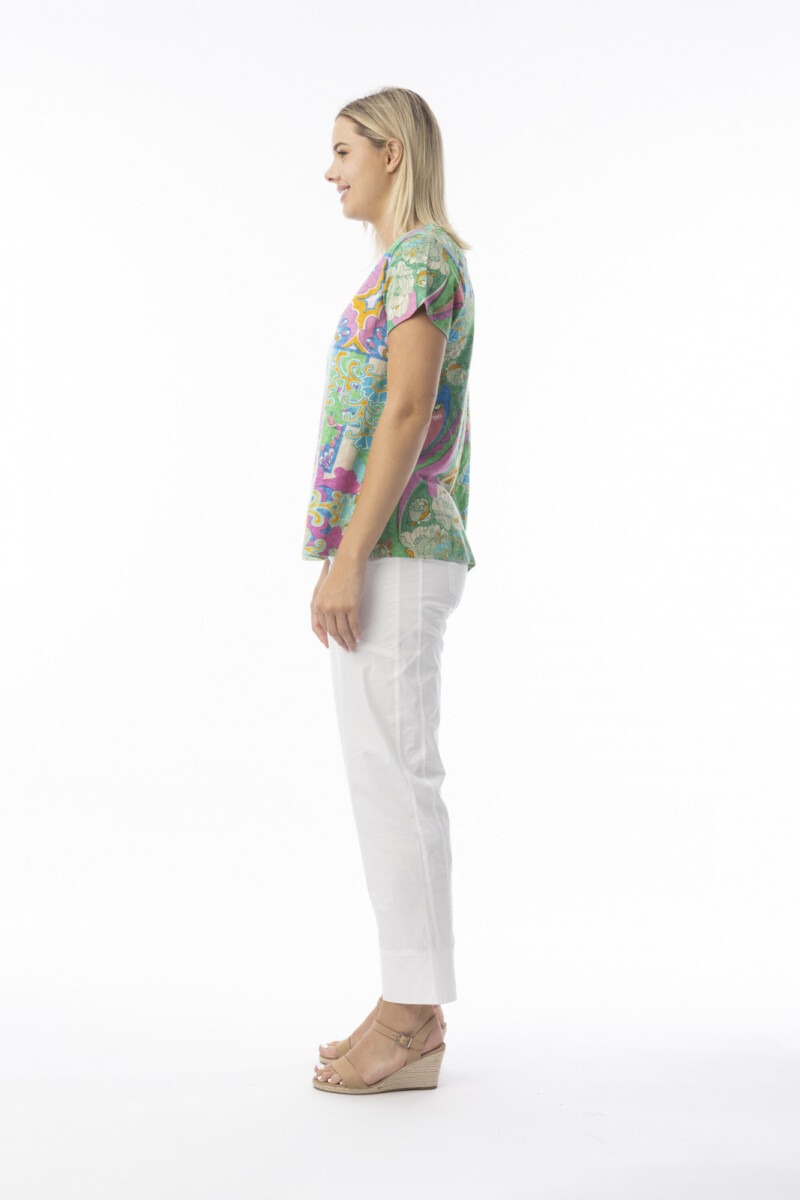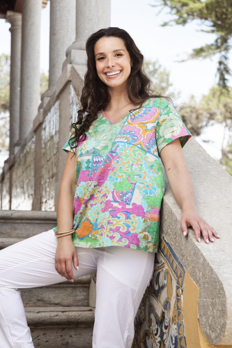 Brighten your everyday wardrobe with our contemporary crew t-shirt. Crafted from 100% organic cotton, this t-shirt features a comfortable crew neck, bold colours, and beautiful prints. This t-shirt is perfect for elevating any basic outfit this summer!