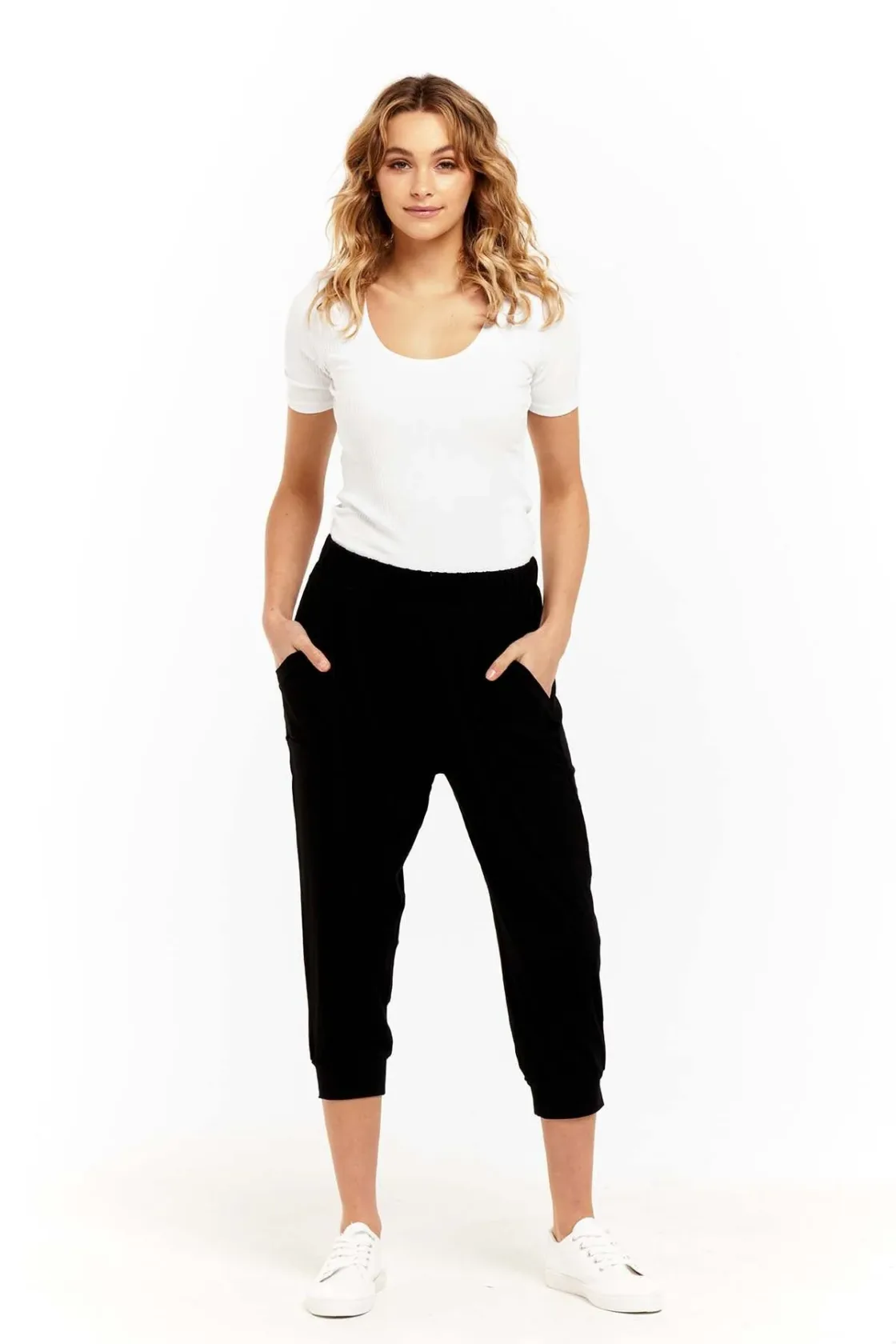 A slouchy pant with an elastic waist for added comfort, the Tokyo 3/4 length pant is made from ultra soft and stretchy viscose. These casual pants hang beautifully, and are so comfortable! You will literally live in them! Featuring pockets. Pair with a cute colourful singlet and comfy shoes.