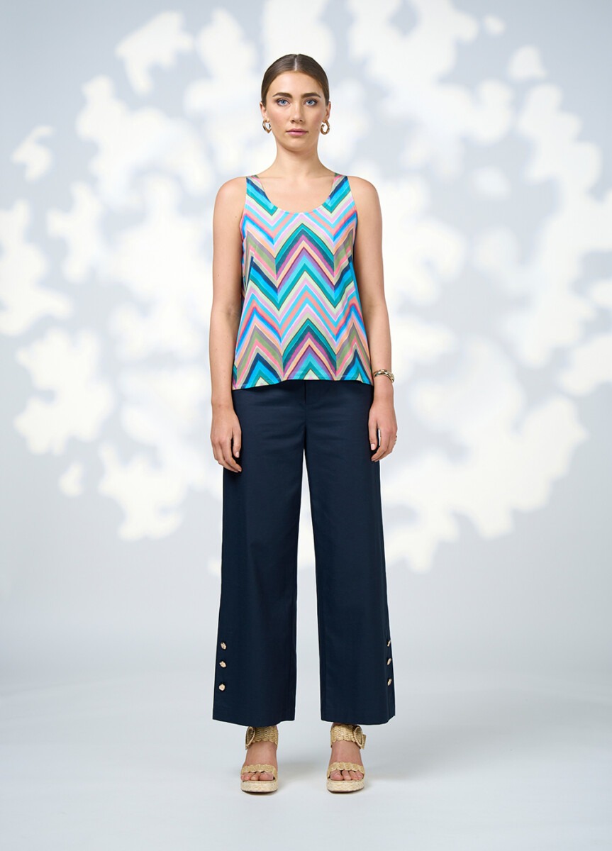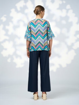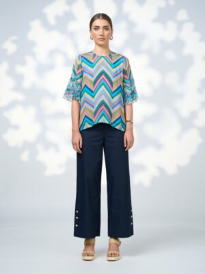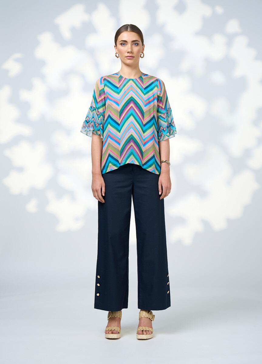 Printed sheer crew neck top with buttoned back neck split, square hem and side splits. Flared sleeves feature gathered tiers in a contrast mirco print.