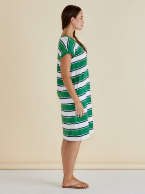 The Zena T-Shirt Dress is a relaxed, easy-to-wear piece featuring a V-neckline and grown-on sleeves with turn-back cuffs. Knee length and equipped with pockets, it offers an elevated yet comfortable silhouette. A classic, effortless trans-seasonal dress designed for versatile styling.